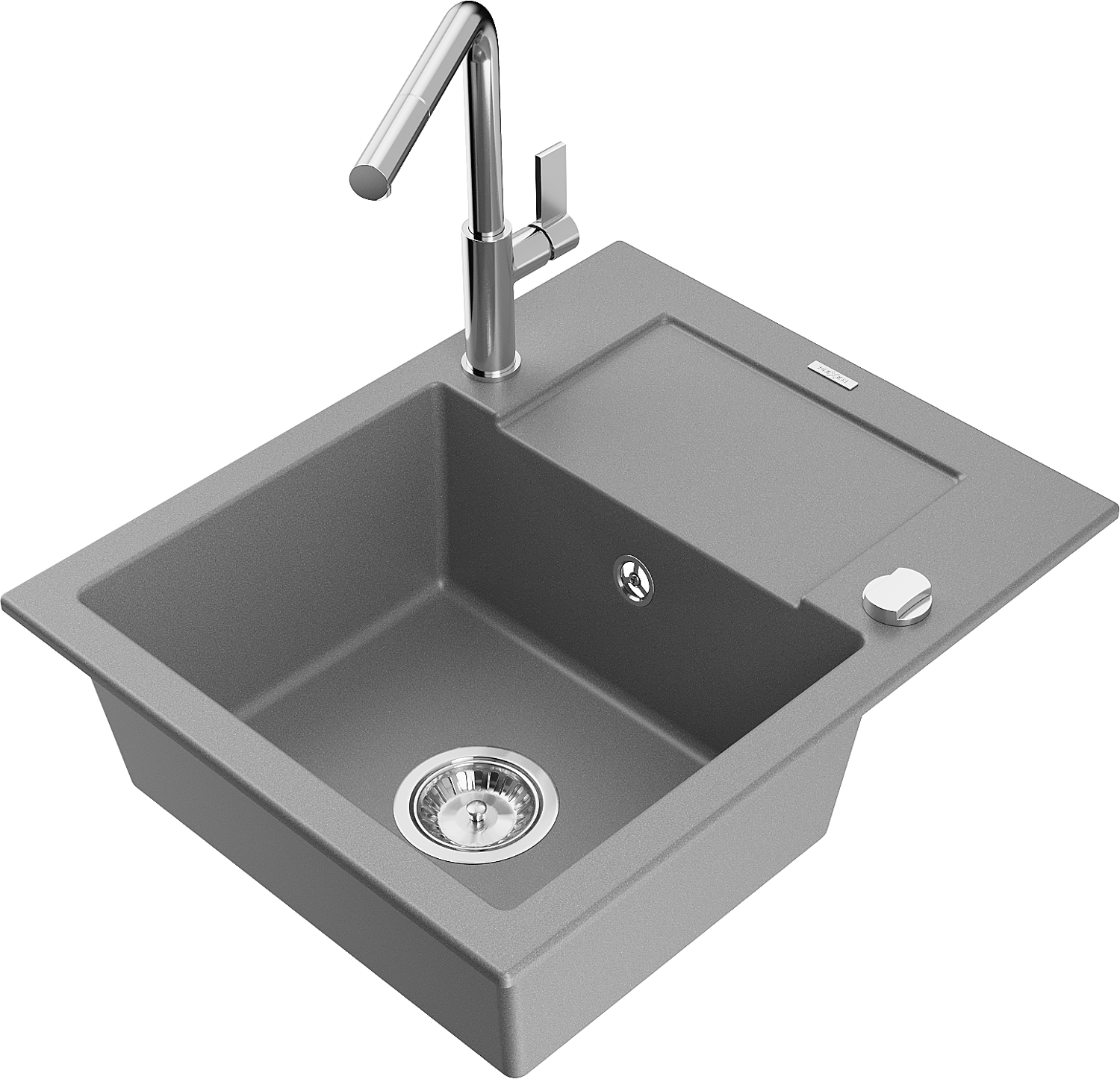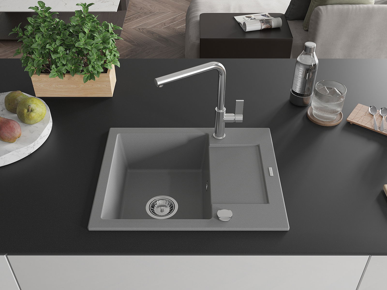 Mexen Enzo Granitspüle 1-becken mit Abtropfbrett und Küchenarmatur Flora, grau - 6506-71-670401-00