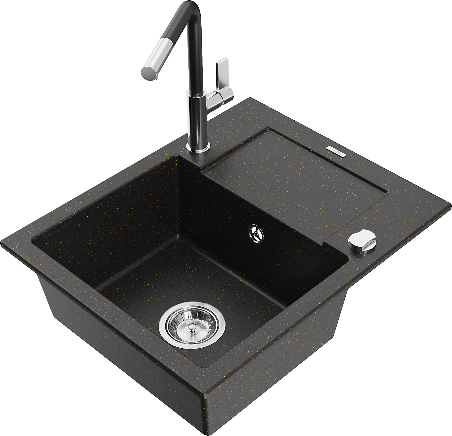 Mexen Enzo Granitspüle mit 1 Becken, Abtropffläche und Küchenarmatur Flora, schwarz/gold glänzend - 6506-75-670401-07