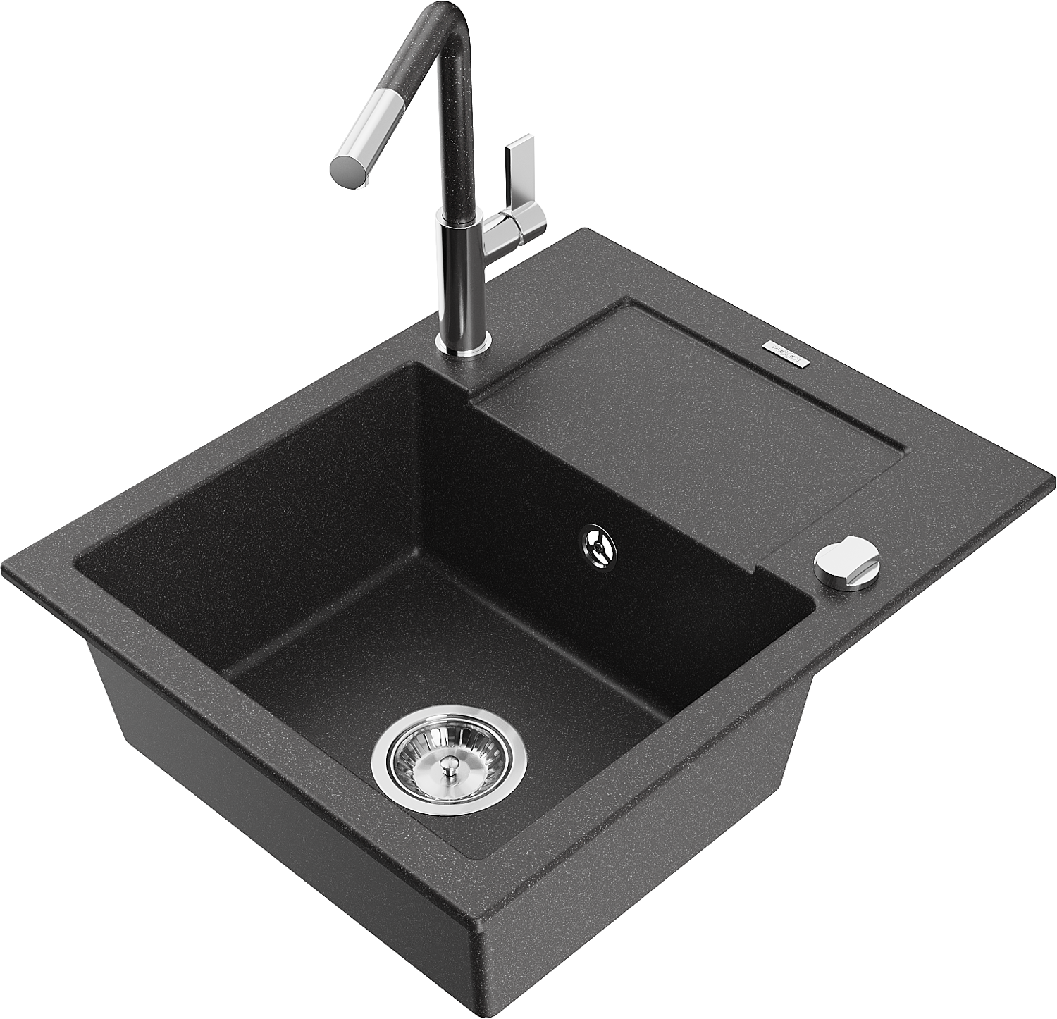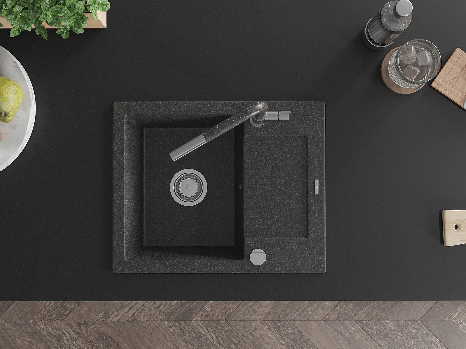 Mexen Enzo Granitspüle 1-becken mit Abtropffläche und Küchenarmatur Flora, schwarz gesprenkelt - 6506-76-670401-08