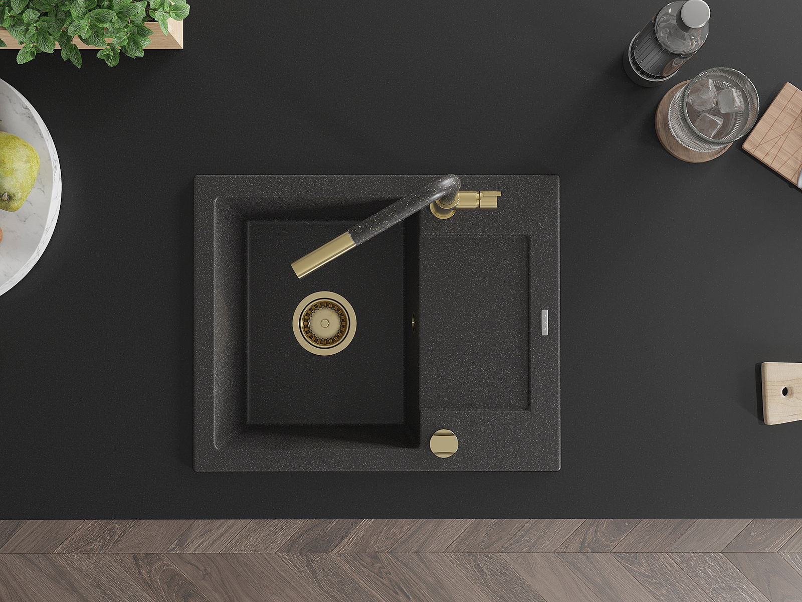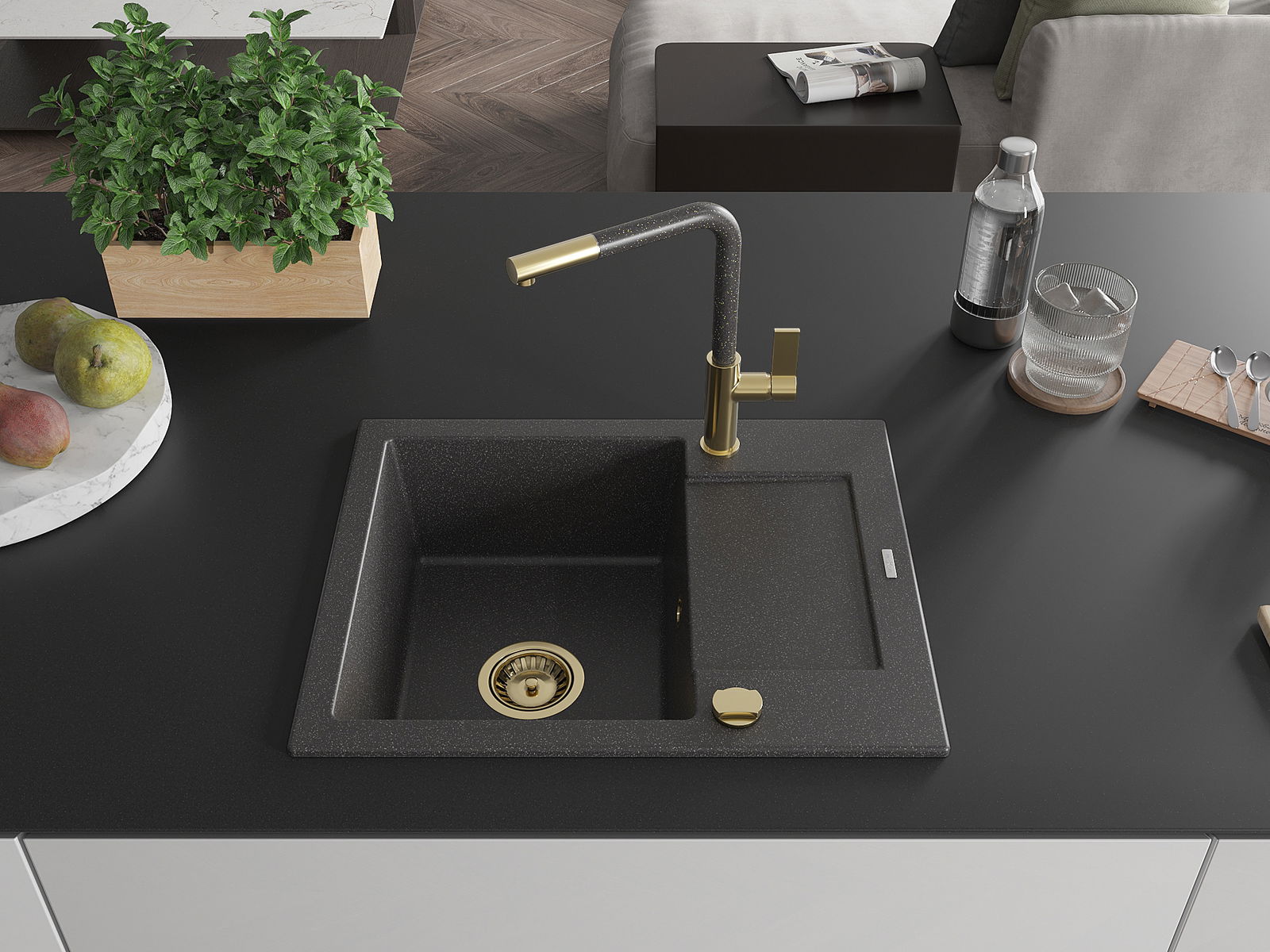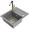 Die Spüle besteht aus hochwertigem Granit. Es ist eine elegante und vor allem praktische Ergänzung zu jeder Küche, unabhängig von ihrem Stil. Hohe Qualität und Granitdauer sorgen für eine langjährige Nutzung.