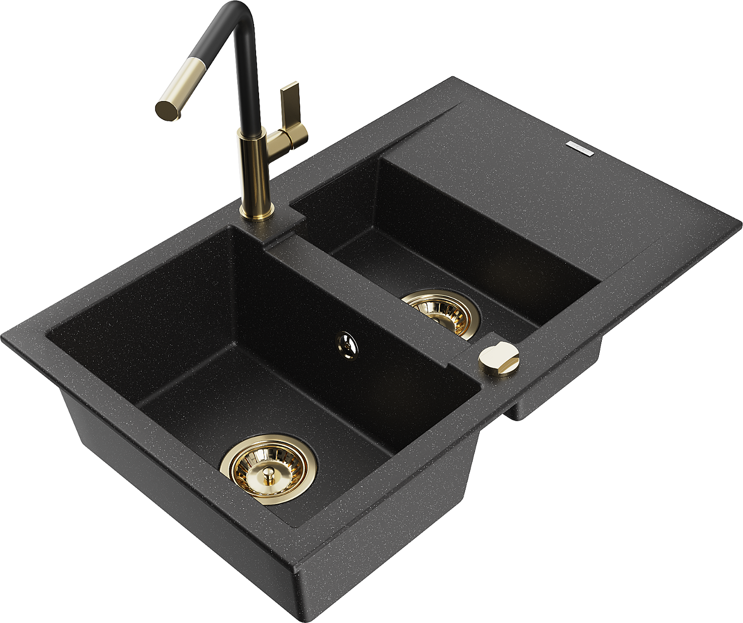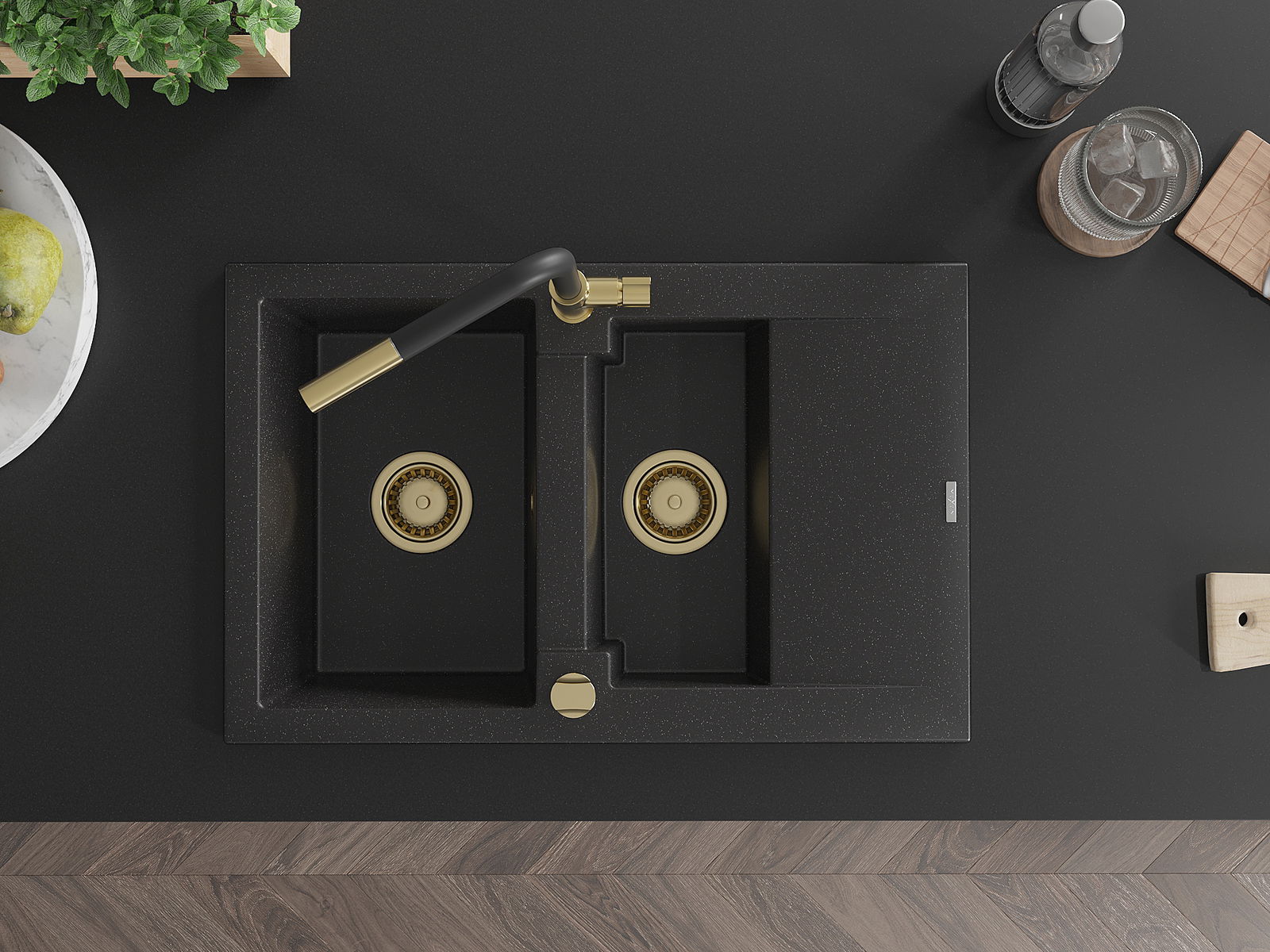 Mexen Gaspar Granitspüle 1,5-Becken mit Abtropfbereich und Küchenarmatur Flora, schwarz/silber - 6507-73-670401-57-G