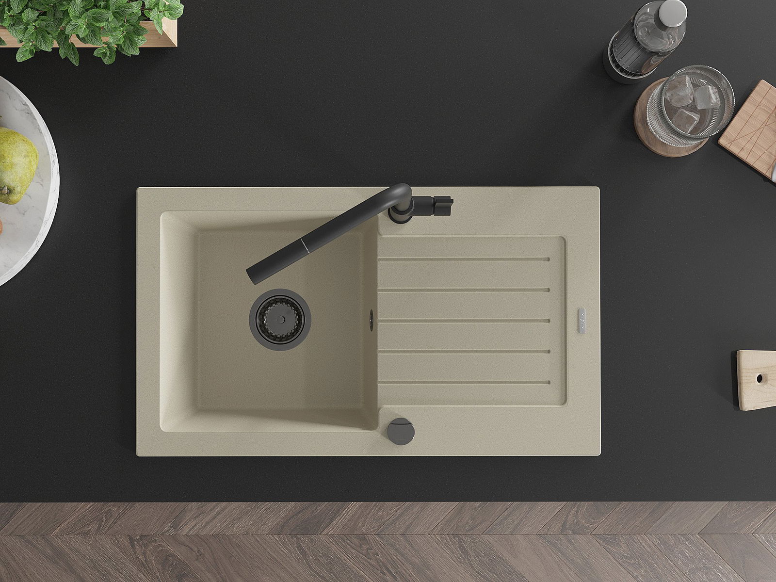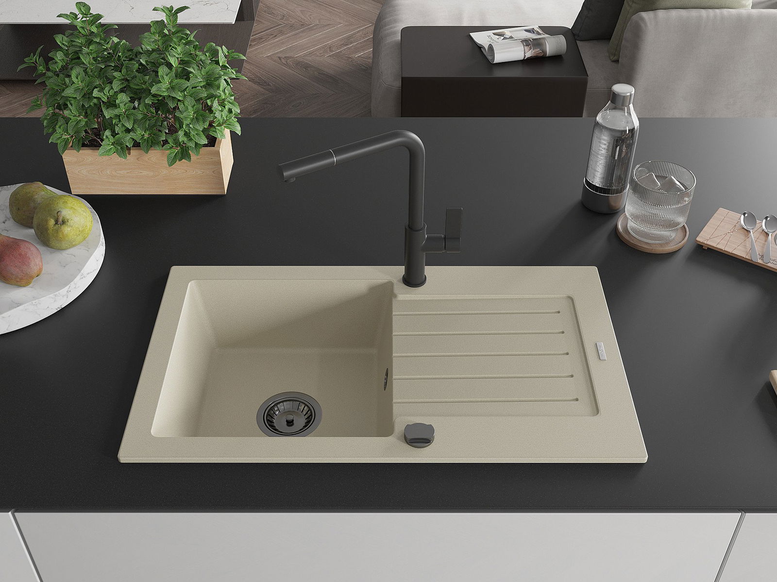 Die Spüle besteht aus hochwertigem Granit. Es ist eine elegante und vor allem praktische Ergänzung zu jeder Küche, unabhängig von ihrem Stil. Hohe Qualität und Granitdauer sorgen für eine langjährige Nutzung.