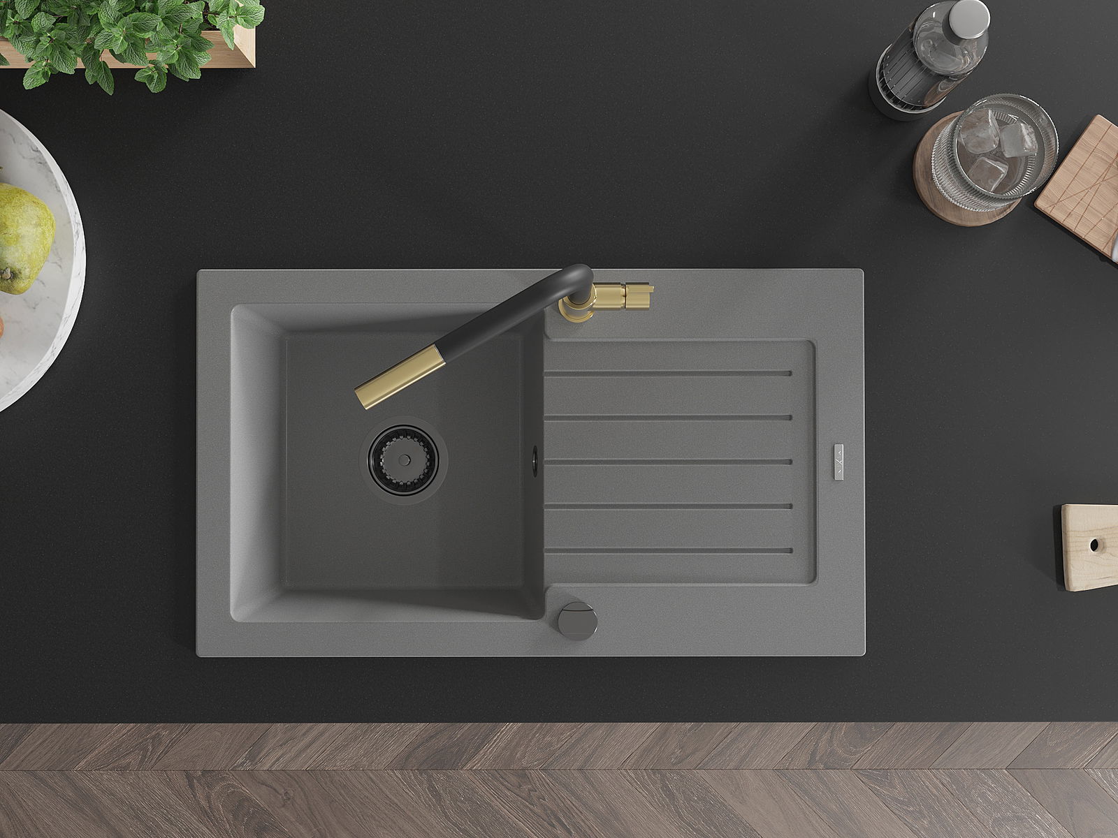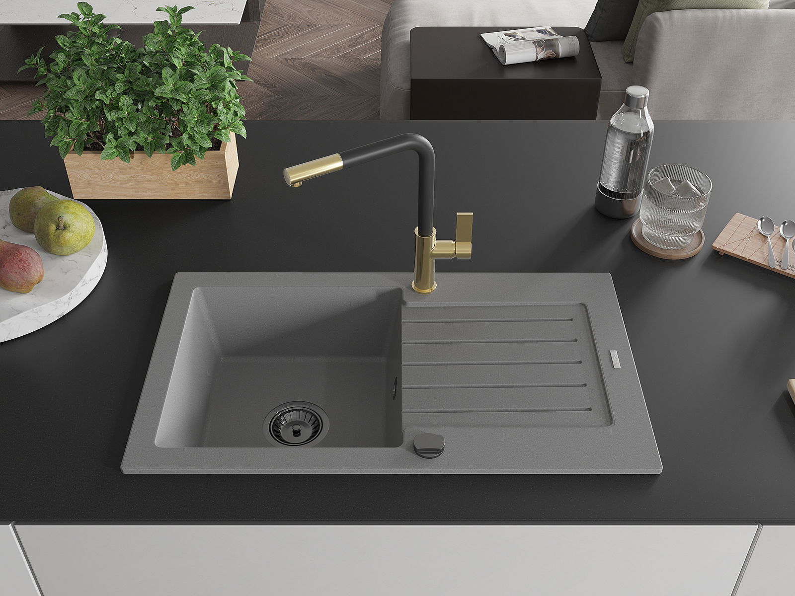 Die Spüle besteht aus hochwertigem Granit. Es ist eine elegante und vor allem praktische Ergänzung zu jeder Küche, unabhängig von ihrem Stil. Hohe Qualität und Granitdauer sorgen für eine langjährige Nutzung.