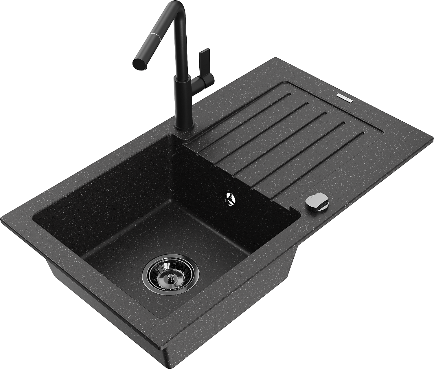 Mexen Pablo Granitspüle mit 1 Becken, Abtropffläche und Küchenarmatur Flora, schwarz/silber metallic - 6510-73-670401-70-B