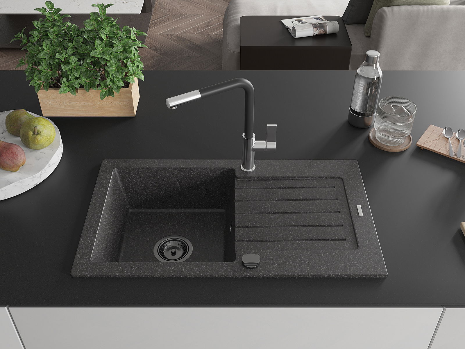 Die Spüle besteht aus hochwertigem Granit. Es ist eine elegante und vor allem praktische Ergänzung zu jeder Küche, unabhängig von ihrem Stil. Hohe Qualität und Granitdauer sorgen für eine langjährige Nutzung.