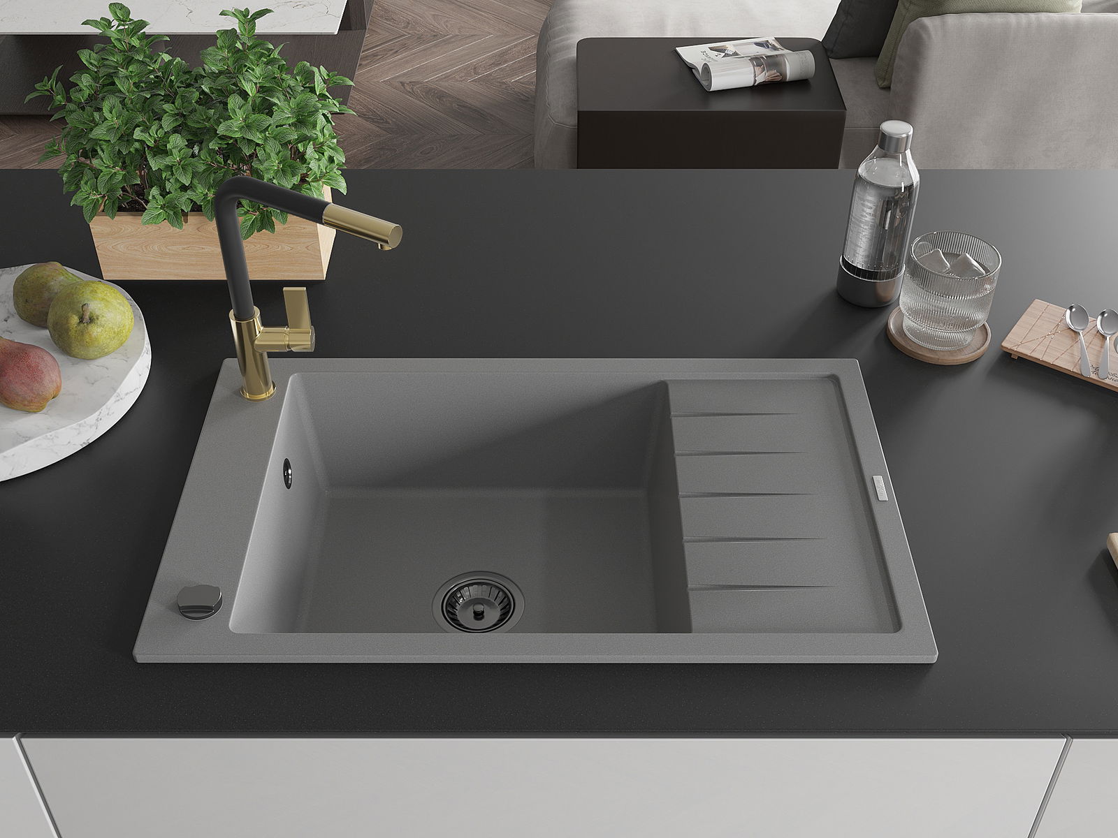 Mexen Elias Granitspüle 1-Becken mit Abtropffläche und Küchenarmatur Flora, grau - 6511-71-670401-57-B