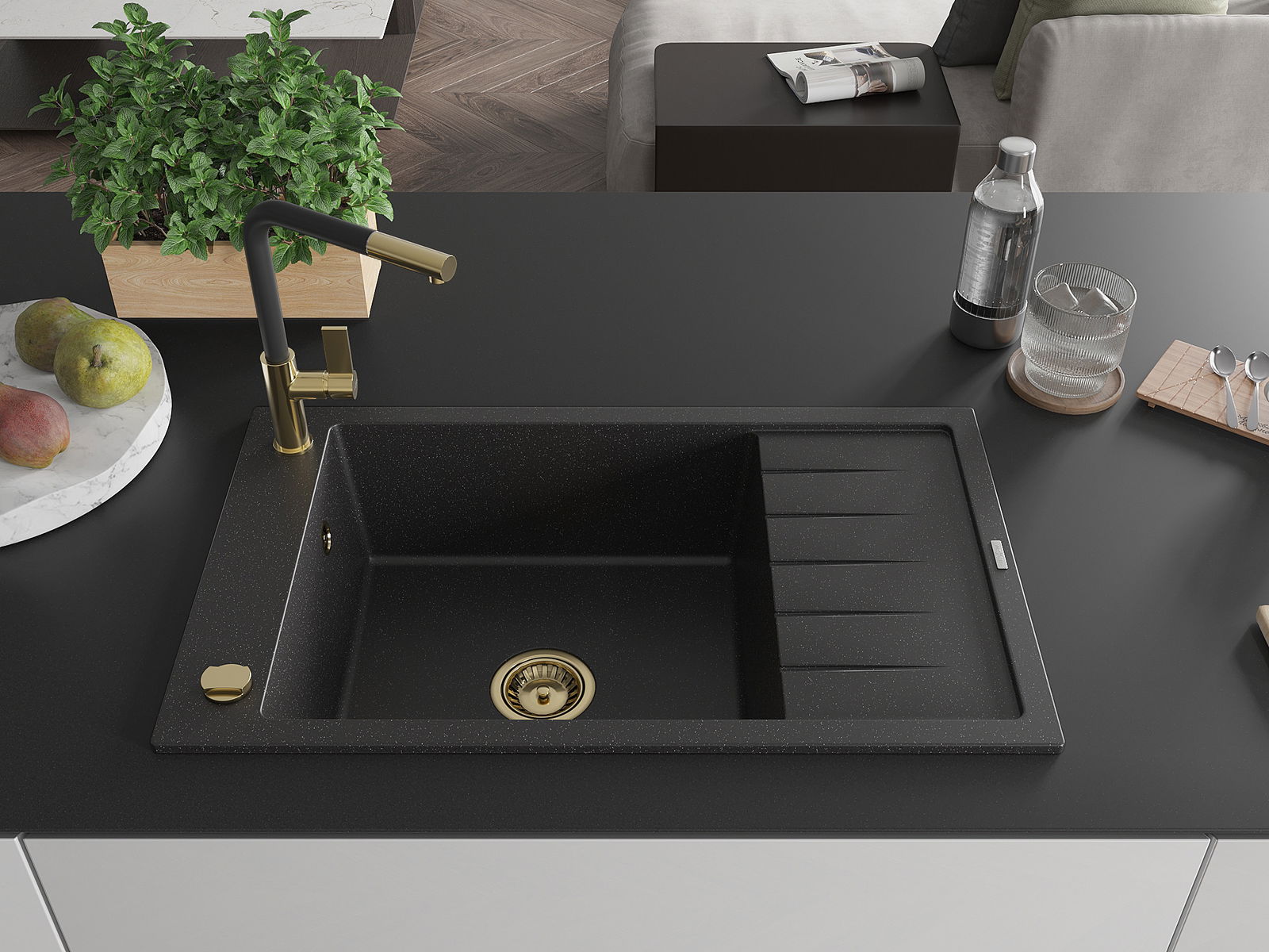 Die Spüle besteht aus hochwertigem Granit. Es ist eine elegante und vor allem praktische Ergänzung zu jeder Küche, unabhängig von ihrem Stil. Hohe Qualität und Granitdauer sorgen für eine langjährige Nutzung.