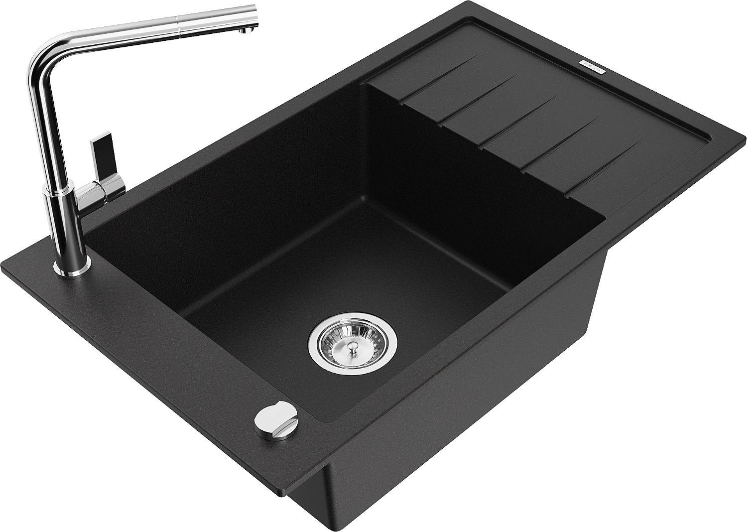 Die Spüle besteht aus hochwertigem Granit. Es ist eine elegante und vor allem praktische Ergänzung zu jeder Küche, unabhängig von ihrem Stil. Hohe Qualität und Granitdauer sorgen für eine langjährige Nutzung.