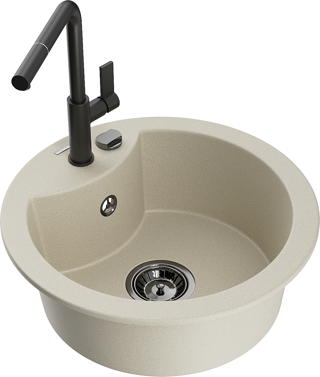 Die Spüle besteht aus hochwertigem Granit. Es ist eine elegante und vor allem praktische Ergänzung zu jeder Küche, unabhängig von ihrem Stil. Hohe Qualität und Granitdauer sorgen für eine langjährige Nutzung.