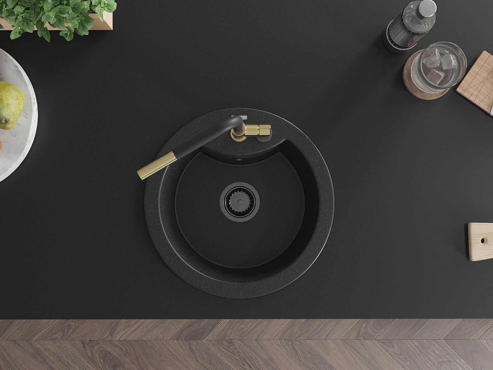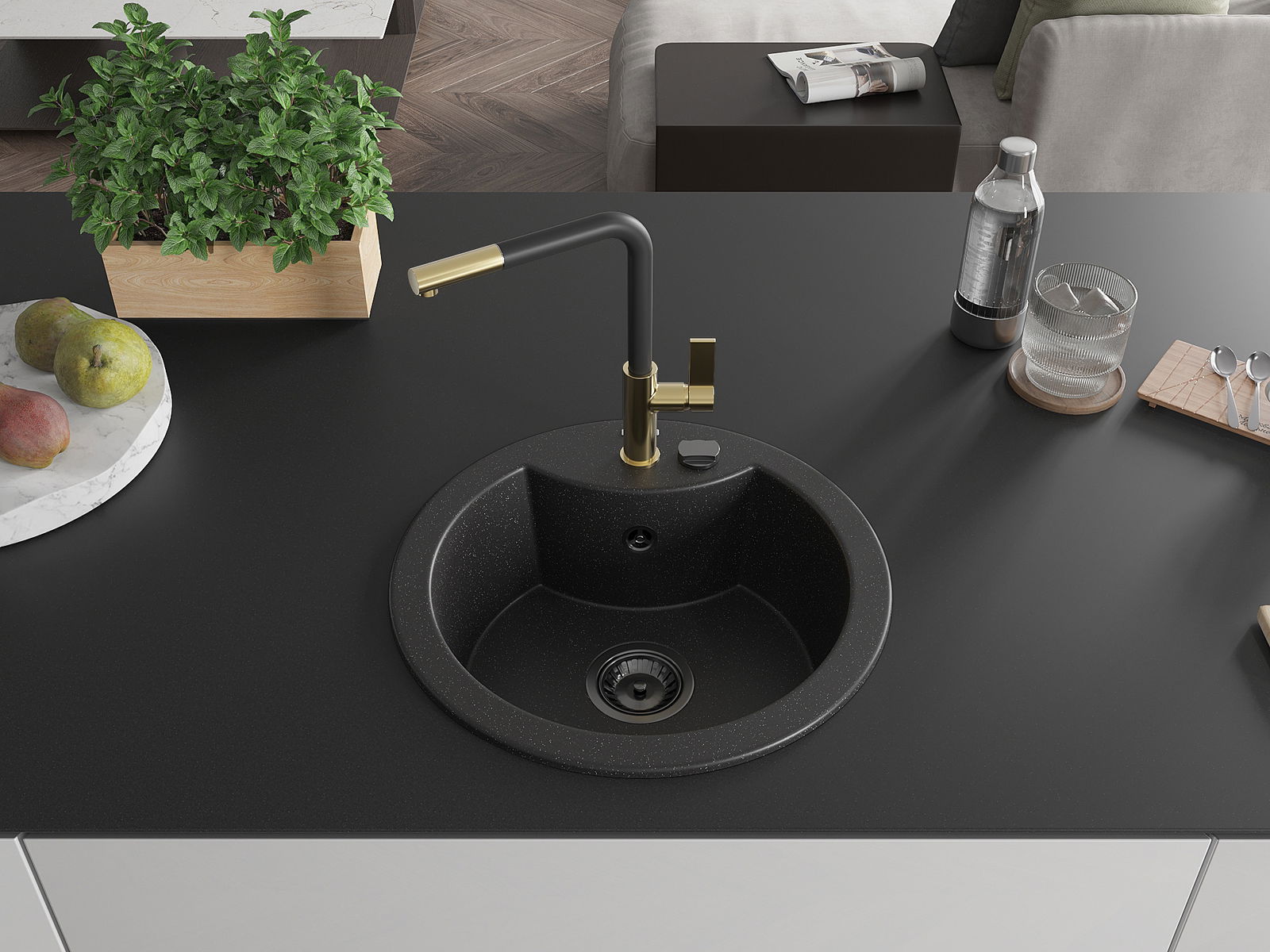 Die Spüle besteht aus hochwertigem Granit. Es ist eine elegante und vor allem praktische Ergänzung zu jeder Küche, unabhängig von ihrem Stil. Hohe Qualität und Granitdauer sorgen für eine langjährige Nutzung.