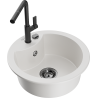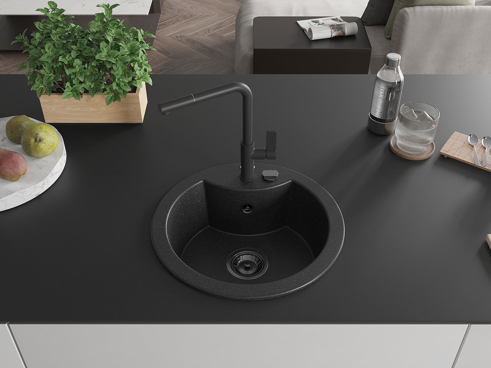 Die Spüle besteht aus hochwertigem Granit. Es ist eine elegante und vor allem praktische Ergänzung zu jeder Küche, unabhängig von ihrem Stil. Hohe Qualität und Granitdauer sorgen für eine langjährige Nutzung.