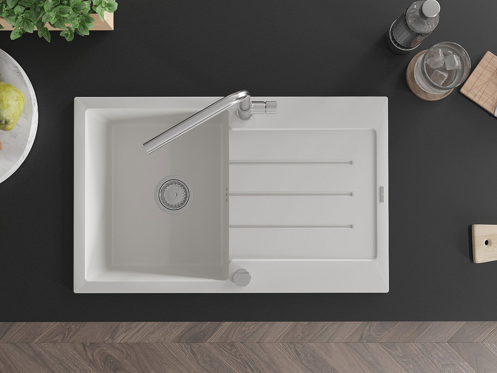 Mexen Bruno Granitspüle 1-Becken mit Abtropffläche und Küchenarmatur Flora, weiß - 6513-20-670401-00