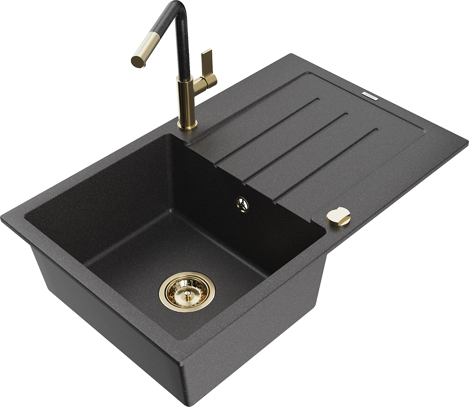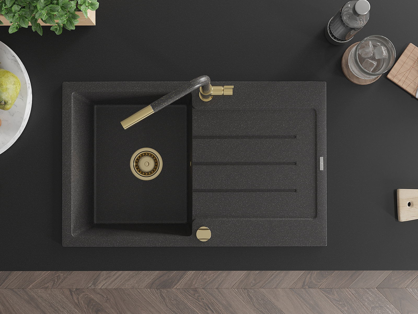 Mexen Bruno Granitspüle 1-beckig mit Abtropffläche und Küchenarmatur Flora, schwarz gesprenkelt - 6513-76-670401-75-G