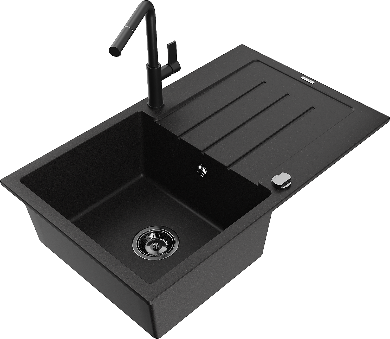 Mexen Bruno Granitspüle 1-becken mit Abtropffläche und Küchenarmatur Flora, schwarz - 6513-77-670401-70-B