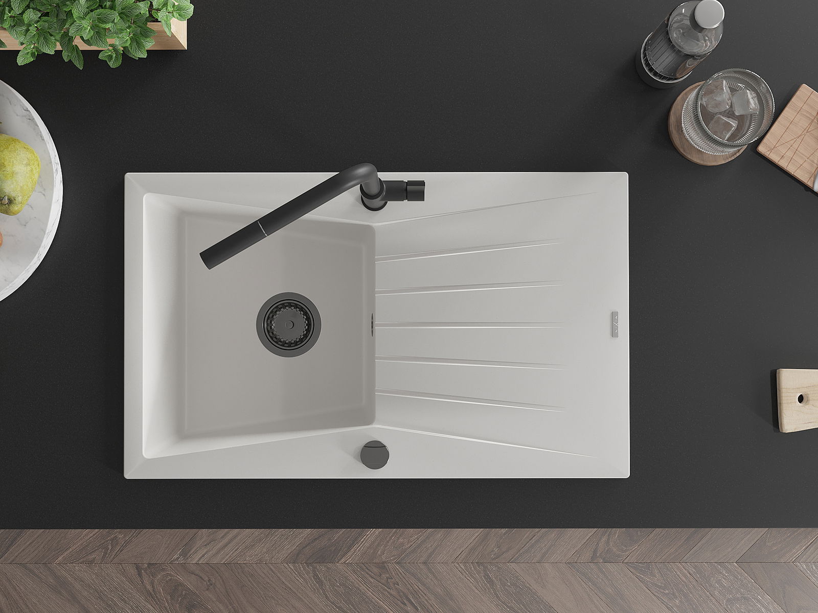 Mexen Cesar Granitspüle 1-komrig mit Abtropffläche und Küchenarmatur Flora, weiß - 6514-20-670401-70-B