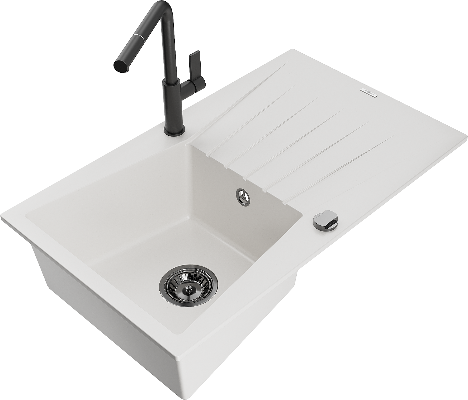 Die Spüle besteht aus hochwertigem Granit. Es ist eine elegante und vor allem praktische Ergänzung zu jeder Küche, unabhängig von ihrem Stil. Hohe Qualität und Granitdauer sorgen für eine langjährige Nutzung.