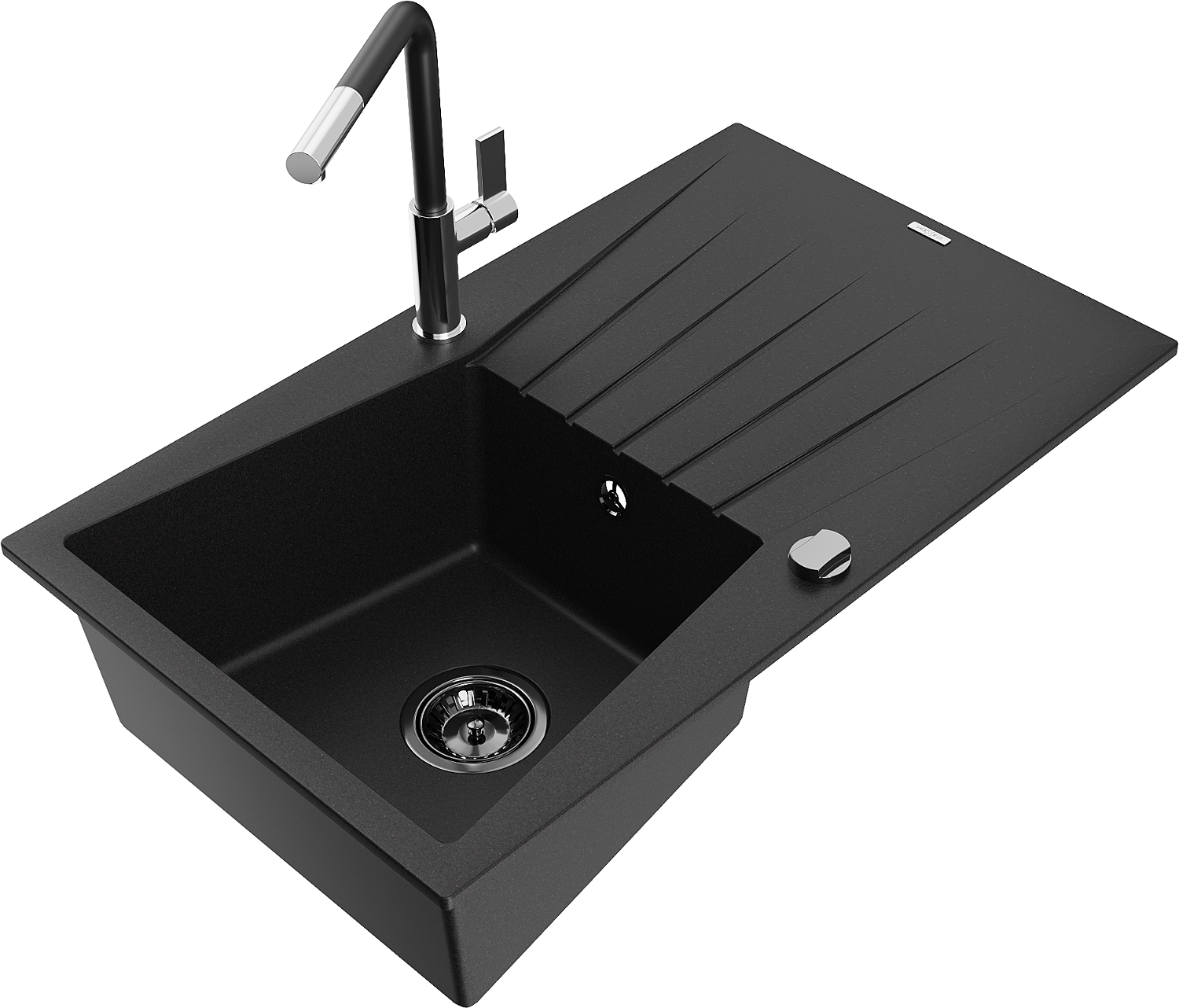 Mexen Cesar Granitspüle, 1-Becken mit Abtropffläche und Küchenarmatur Flora, schwarz - 6514-77-670401-07-B