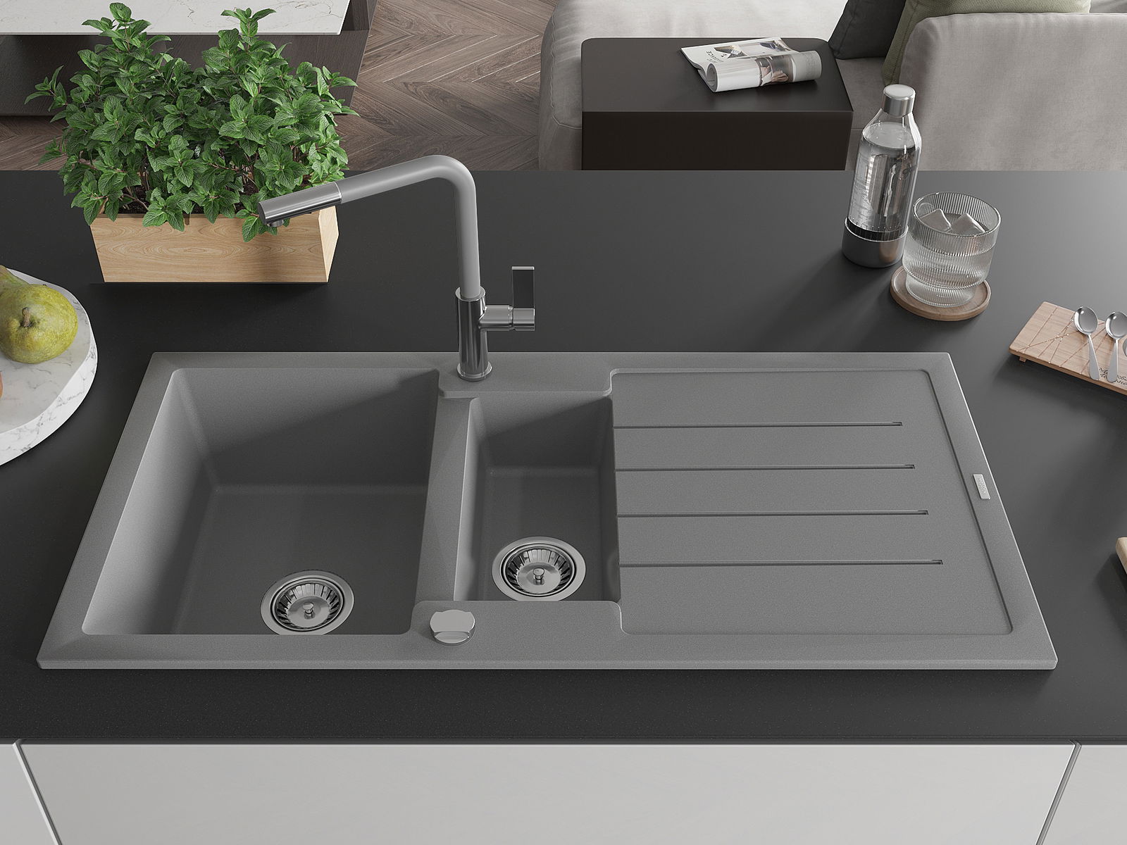 Die Spüle besteht aus hochwertigem Granit. Es ist eine elegante und vor allem praktische Ergänzung zu jeder Küche, unabhängig von ihrem Stil. Hohe Qualität und Granitdauer sorgen für eine langjährige Nutzung.