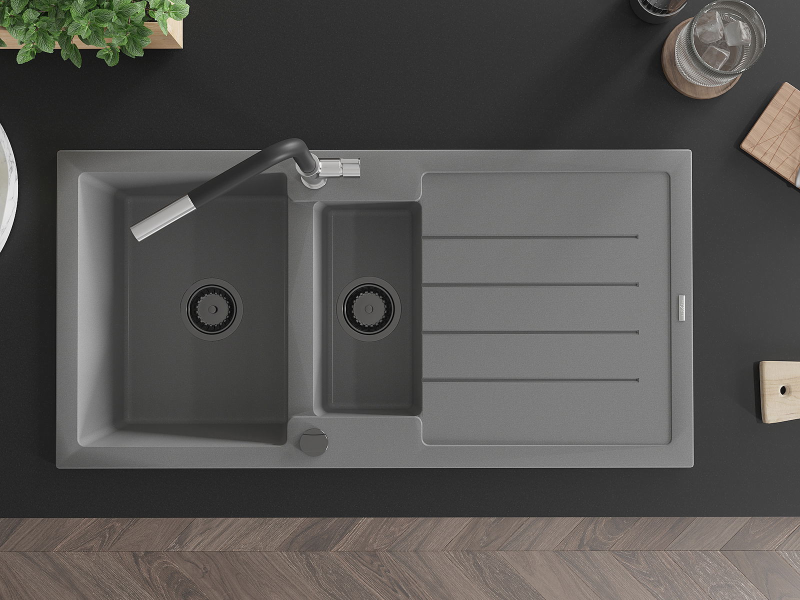Mexen Andres Granitspüle 1,5-Becken mit Abtropffläche und Küchenarmatur Flora, grau - 6515-71-670401-07-B