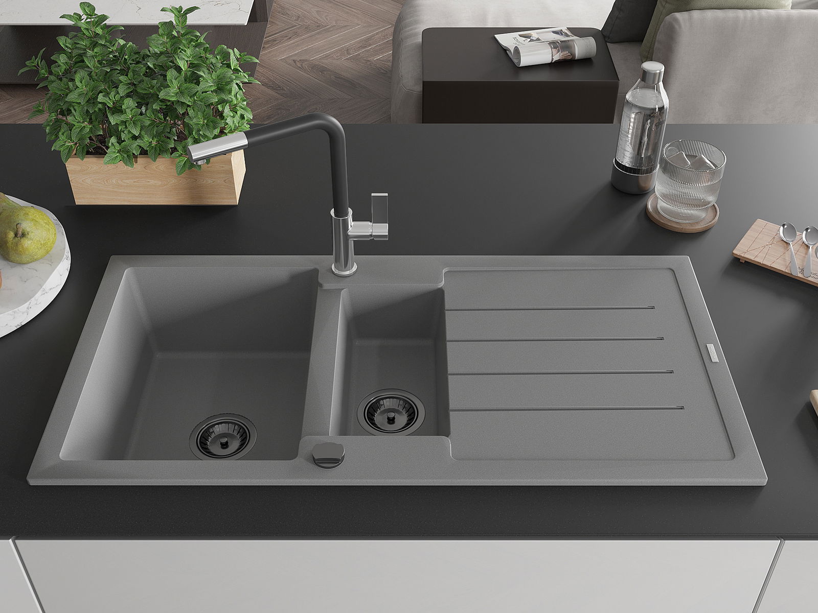 Die Spüle besteht aus hochwertigem Granit. Es ist eine elegante und vor allem praktische Ergänzung zu jeder Küche, unabhängig von ihrem Stil. Hohe Qualität und Granitdauer sorgen für eine langjährige Nutzung.