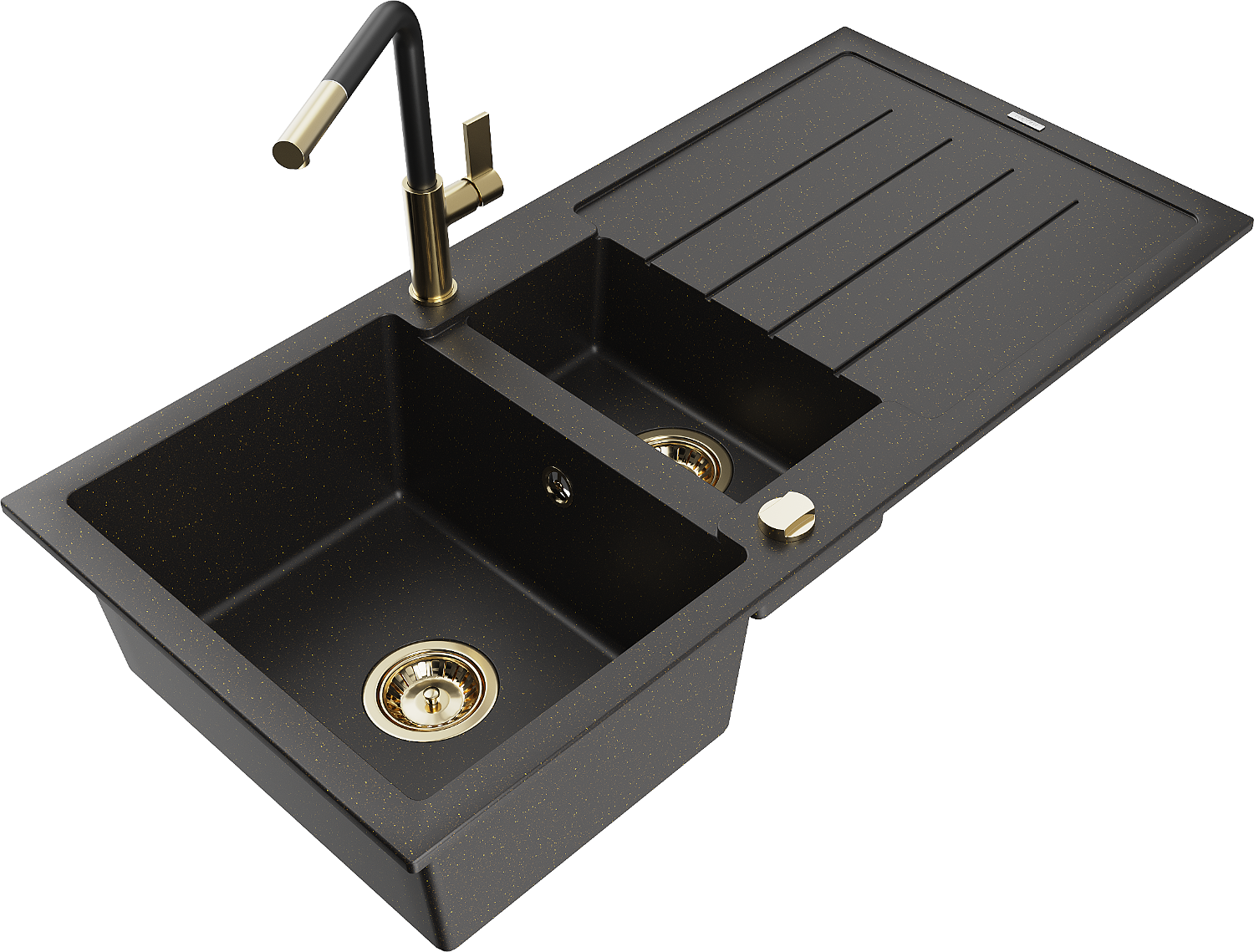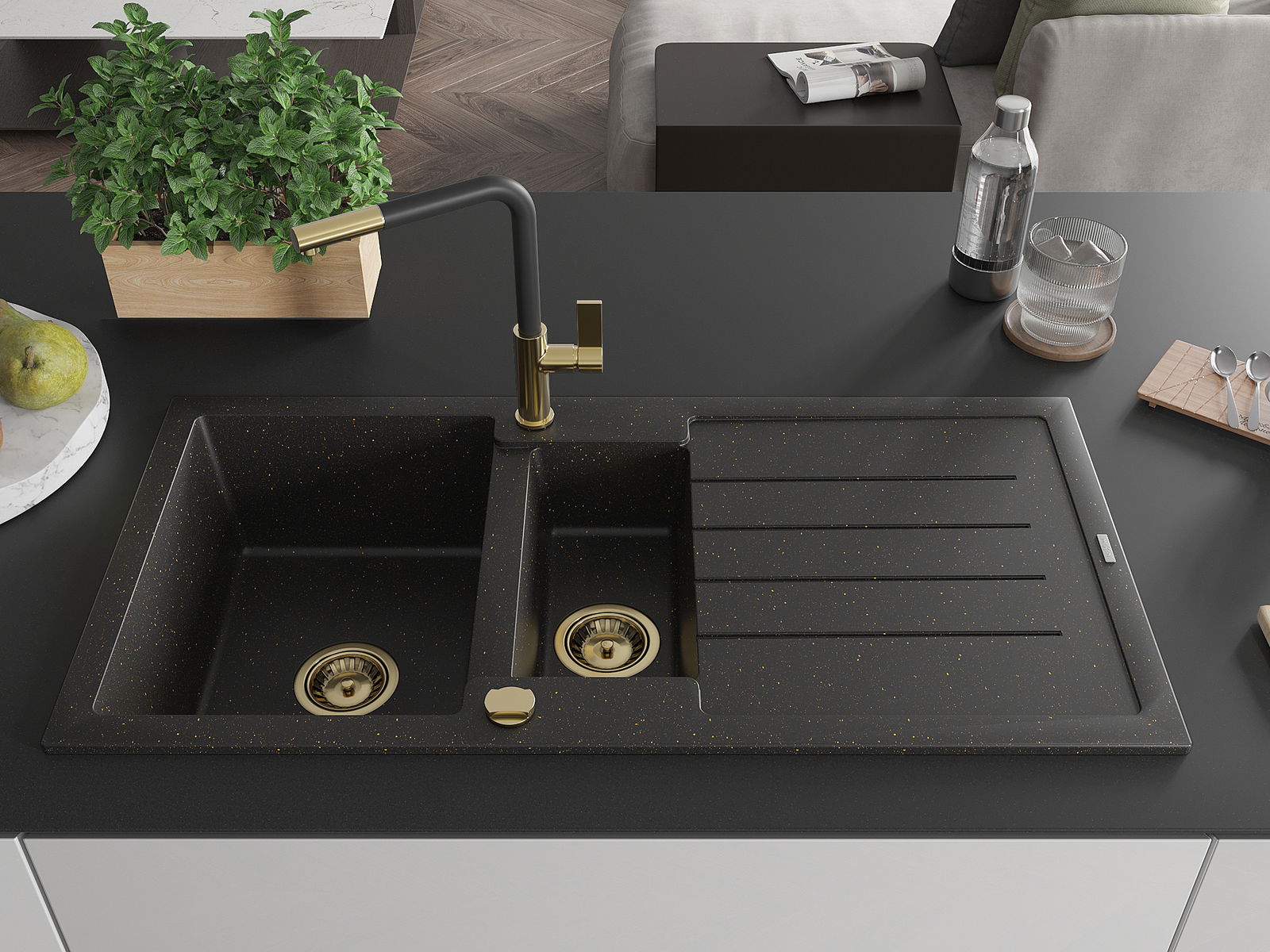 Mexen Andres Granitspüle 1,5-Becken mit Abtropffläche und Küchenarmatur Flora, schwarz/gold - 6515-75-670401-57-G