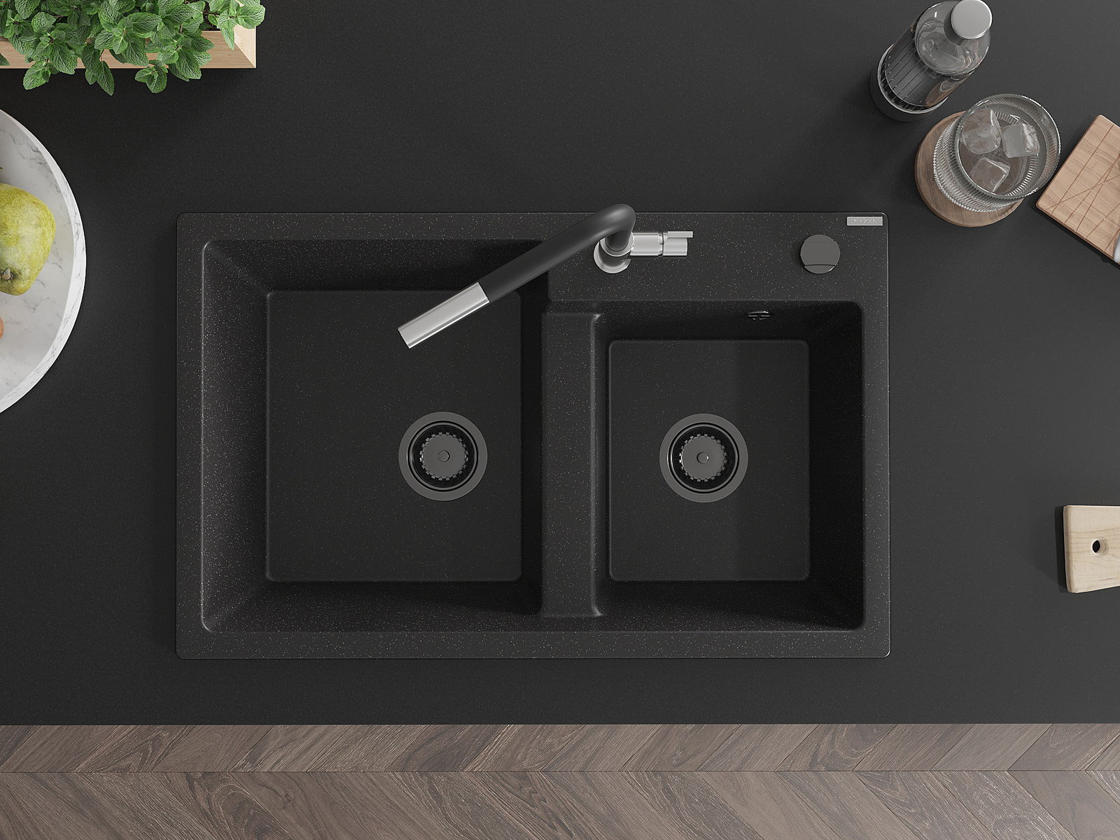 Mexen Tomas Granitspüle 2-Becken mit Küchenarmatur Flora, schwarz/silber metallisch - 6516-73-670401-07-B