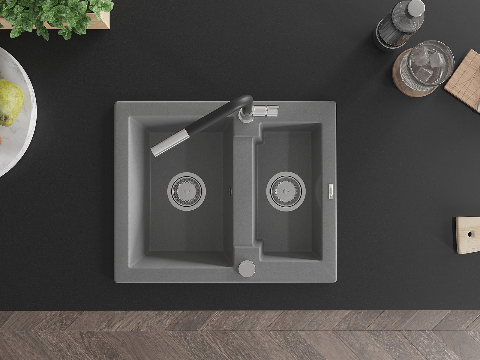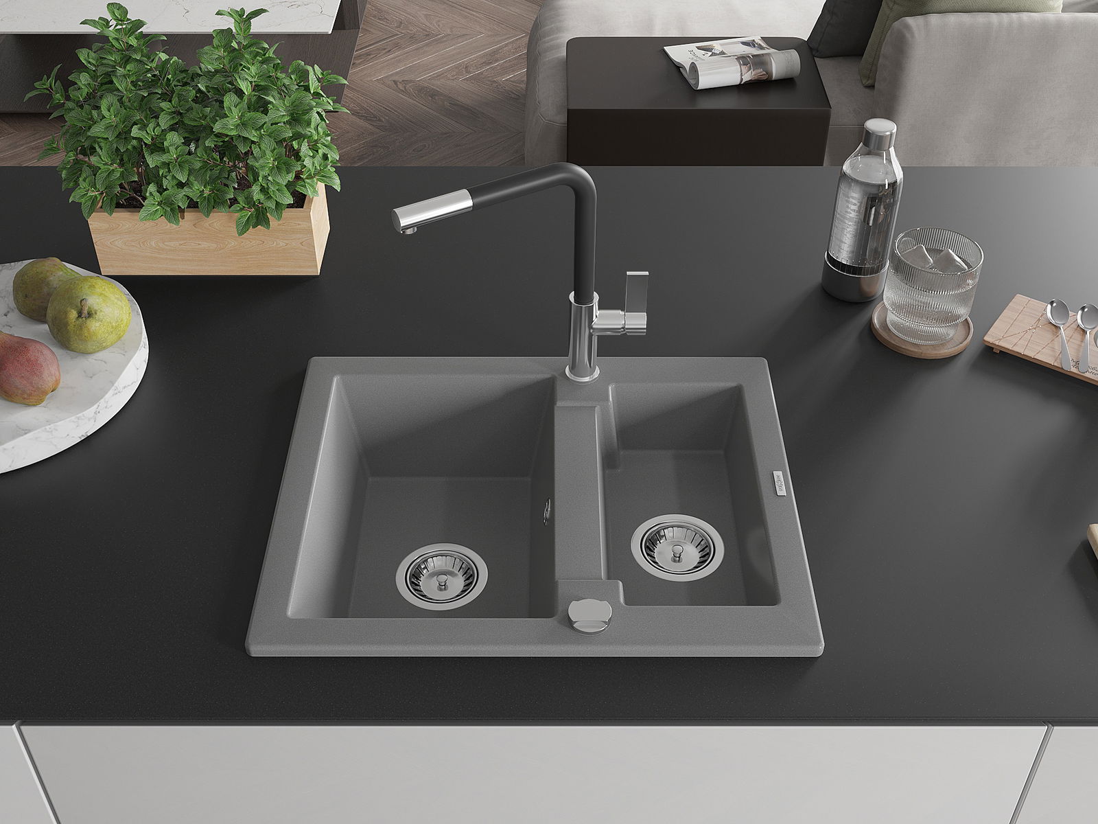Die Spüle besteht aus hochwertigem Granit. Es ist eine elegante und vor allem praktische Ergänzung zu jeder Küche, unabhängig von ihrem Stil. Hohe Qualität und Granitdauer sorgen für eine langjährige Nutzung.