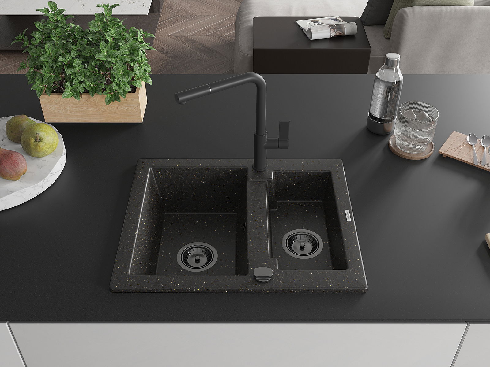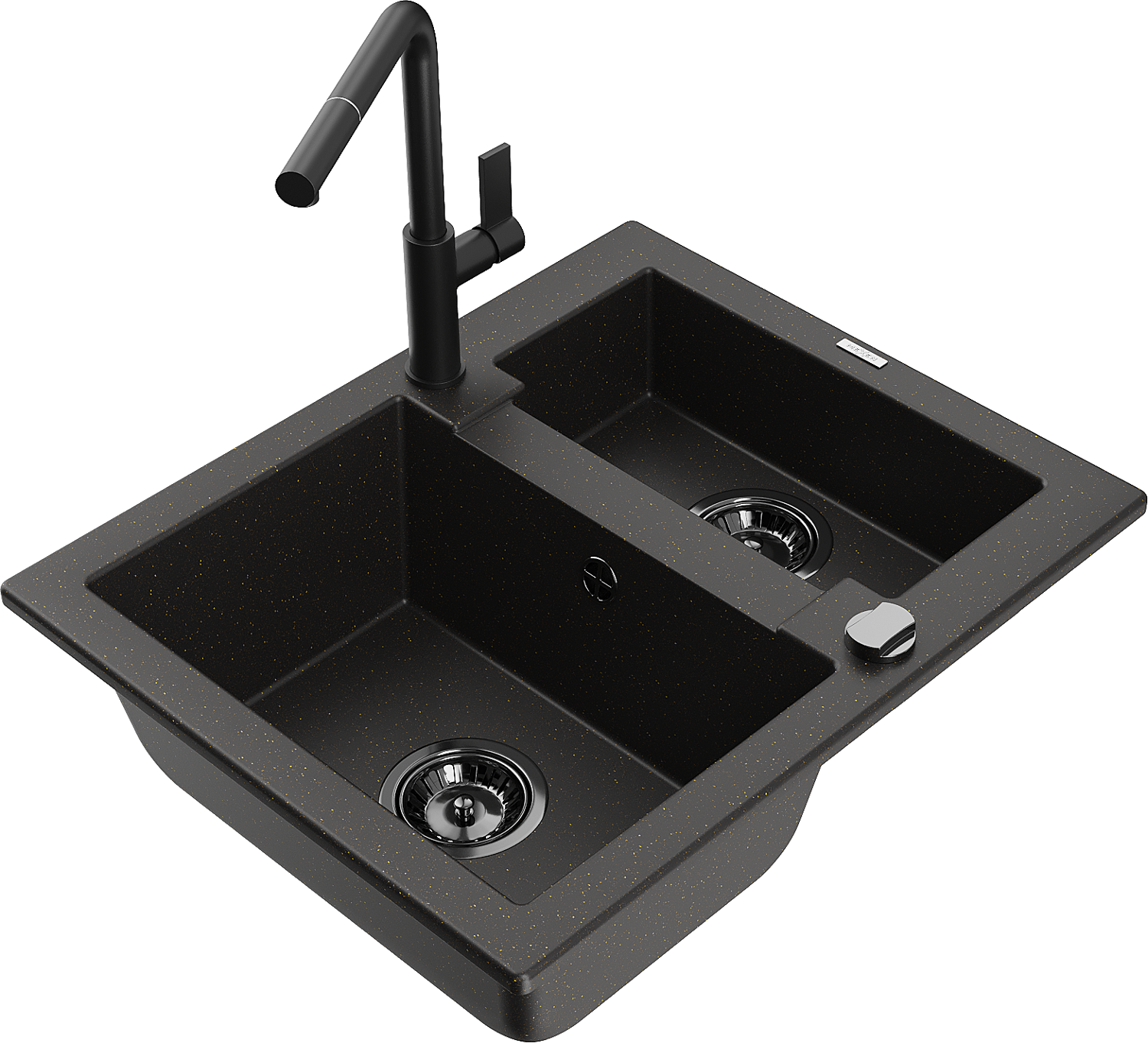 Mexen Carlos Granitspüle 1,5-Becken mit Küchenarmatur Flora, schwarz/goldener Metallic - 6518-75-670401-70-B