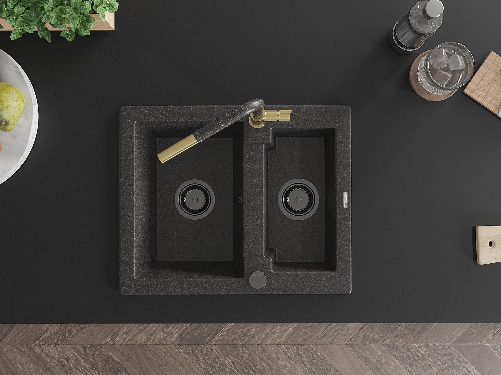 Die Spüle besteht aus hochwertigem Granit. Es ist eine elegante und vor allem praktische Ergänzung zu jeder Küche, unabhängig von ihrem Stil. Hohe Qualität und Granitdauer sorgen für eine langjährige Nutzung.