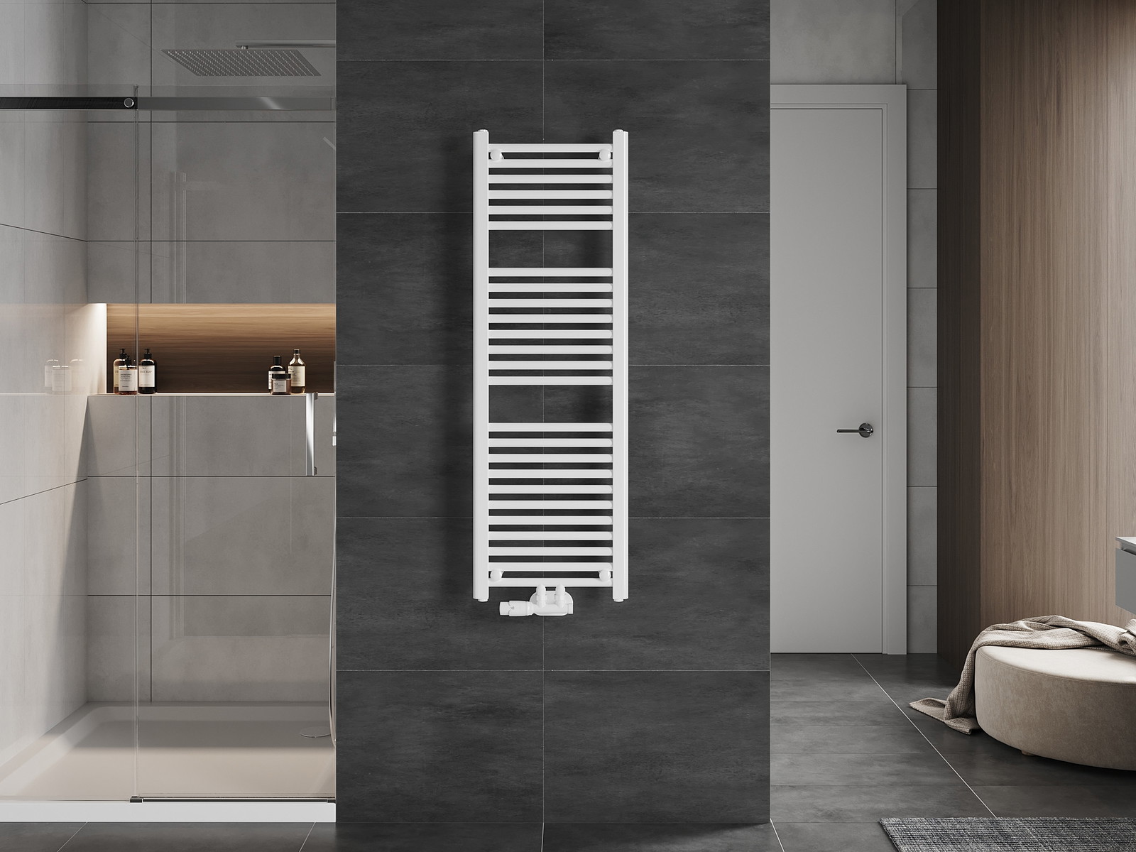 Mexen Mars ist der ideale Badezimmerheizkörper mit den Abmessungen 1200 x 400 mm, der eine Heizleistung von 439 W bei einer Temperatur von 75/65/20 °C bietet. Sein schlankes Design und die elegante weiße Farbe (RAL 9016) passen perfekt in jede Badezimmergestaltung. Hergestellt aus langlebigem und korrosionsbeständigem Stahl, sorgt er für eine lange Lebensdauer. Dank der Möglichkeit zur Montage eines Heizelements und der vielfältigen Anschlüsse (2xG ½″ mittig, 4xG ½″ von oben und unten) ist er äußerst funktional. Das Produkt enthält ein Montageset und Zubehör, was die Installation erleichtert.