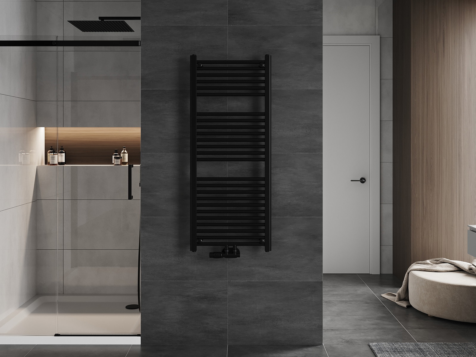 Mexen Mars ist der ideale Badezimmerheizkörper mit den Maßen 1200x500 mm, der eine Heizleistung von 528 W bietet. Dank der eleganten schwarzen Farbe RAL 9005 und der Stahlkonstruktion passt er perfekt zu modernen Innenräumen. Er bietet flexible Anschlussoptionen unten und mittig sowie die Möglichkeit, einen Heizstab zu installieren. Er hält Temperaturen bis zu 95 °C und einem Druck bis zu 0,6 Mpa stand. Die langlebige, korrosionsbeständige Beschichtung und das mitgelieferte Montagezubehör erhöhen die Funktionalität und Benutzerfreundlichkeit.
