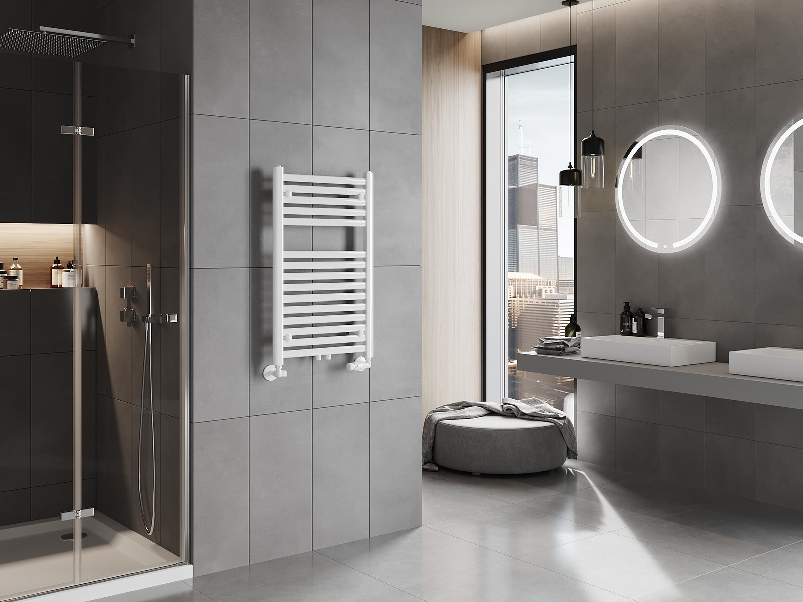 Mexen Hades, eleganter Badezimmerheizkörper mit den Maßen 800 x 500 mm, bietet eine Heizleistung von 386 W und ist somit die ideale Lösung für das Badezimmer. Hergestellt aus langlebigem Stahl, beschichtet mit einer korrosionsbeständigen Lackierung in der Farbe Weiß RAL 9016. Der Heizkörper bietet einen komfortablen Anschluss unten (45 cm) oder zentral (5 cm). Seine geringe Tiefe von 30 mm und die Möglichkeit zur Montage eines Heizelements unterstreichen seine Funktionalität. Vollständiges Montagezubehör im Lieferumfang erleichtert die Installation.