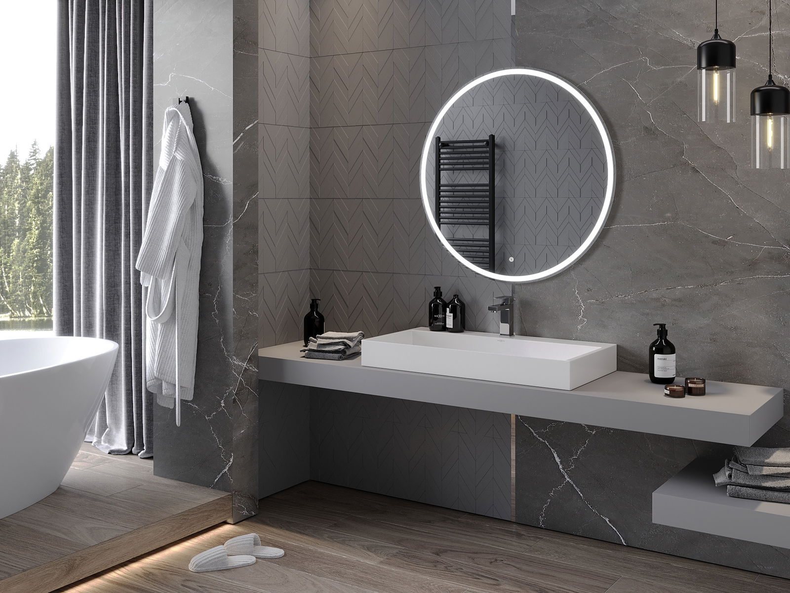 Das Produkt wurde mit einer Heizmatte ausgestattet, wodurch der Spiegel auch nach einem langen und heißen Bad nie verderbt wird. Die Matte beginnt den Beleuchtungsschalter, um die Bequemlichkeit und die Benutzerfreundlichkeit zu gewährleisten.
