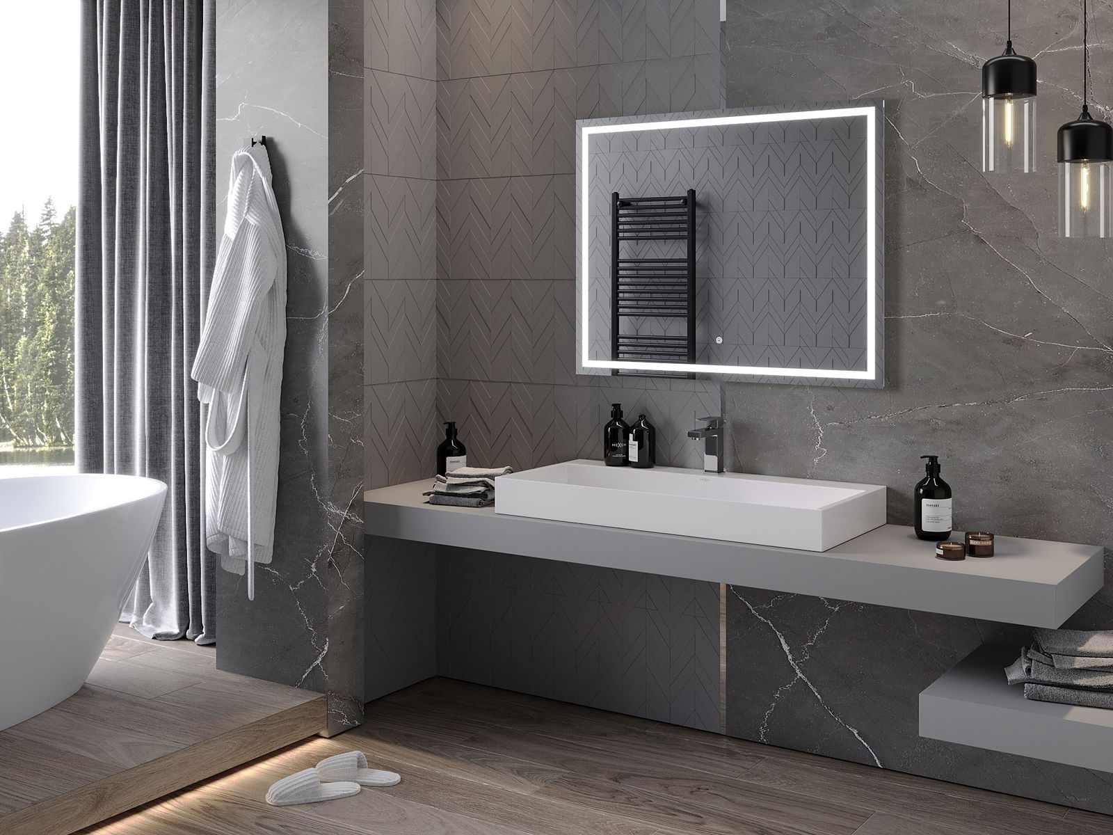 Das Produkt wurde mit einer Heizmatte ausgestattet, wodurch der Spiegel auch nach einem langen und heißen Bad nie verderbt wird. Die Matte beginnt den Beleuchtungsschalter, um die Bequemlichkeit und die Benutzerfreundlichkeit zu gewährleisten.