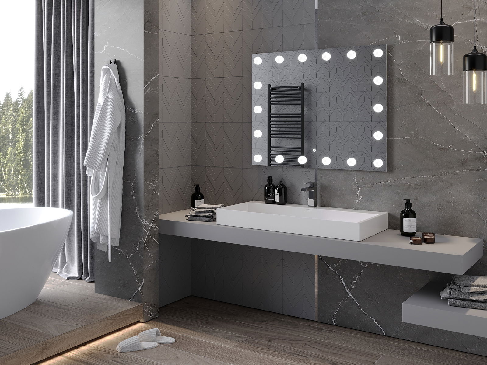 Das Produkt wurde mit einer Heizmatte ausgestattet, wodurch der Spiegel auch nach einem langen und heißen Bad nie verderbt wird. Die Matte beginnt den Beleuchtungsschalter, um die Bequemlichkeit und die Benutzerfreundlichkeit zu gewährleisten.