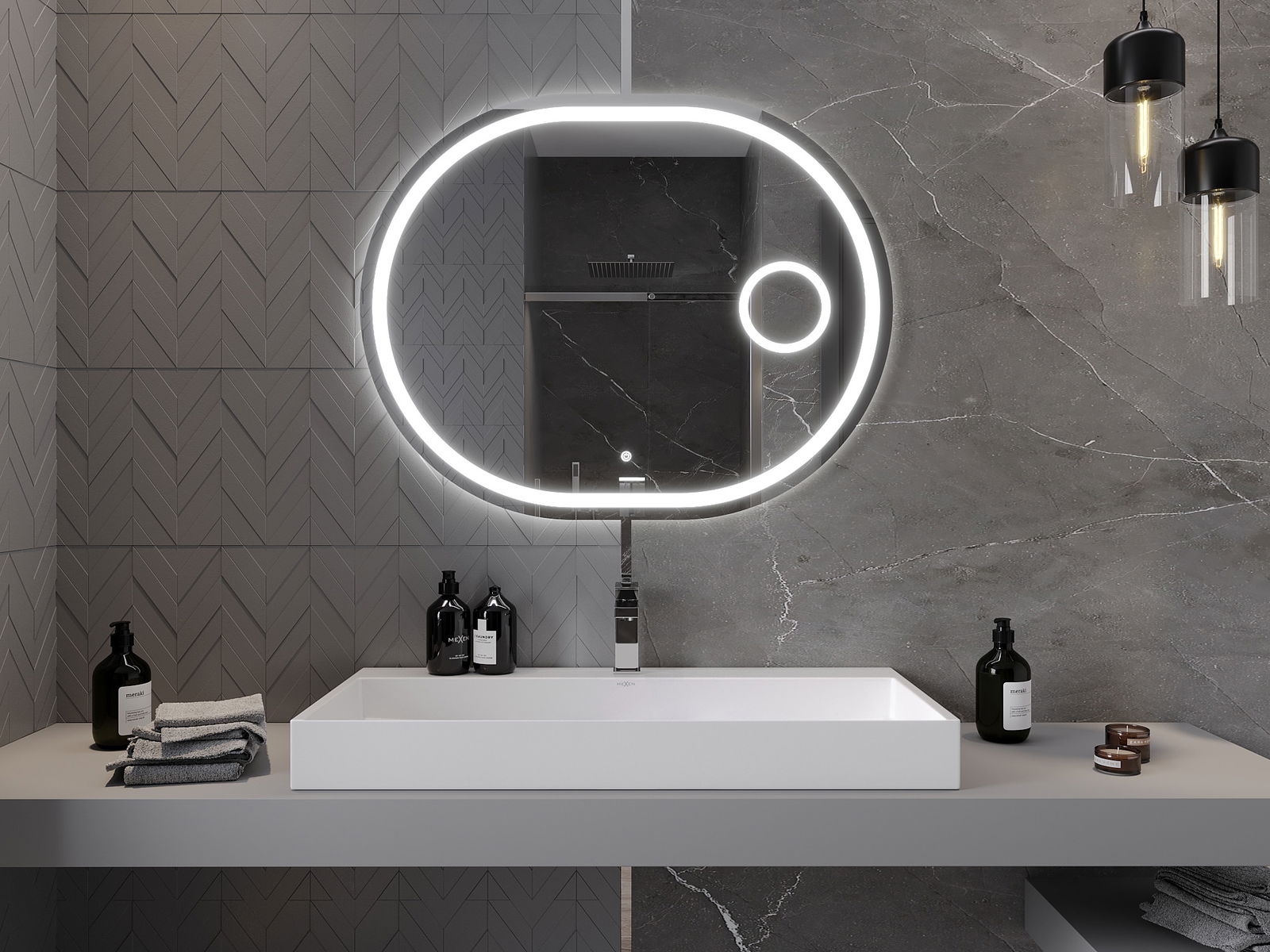Der Spiegel ist mit kalter LED -Beleuchtung - 6000k ausgestattet. Es bietet eine intensive und klare Beleuchtung, mit der Sie auch die kleinsten Details bemerken können. Unterstützt perfekt tägliche Behandlungen mit Gesichtspflege.