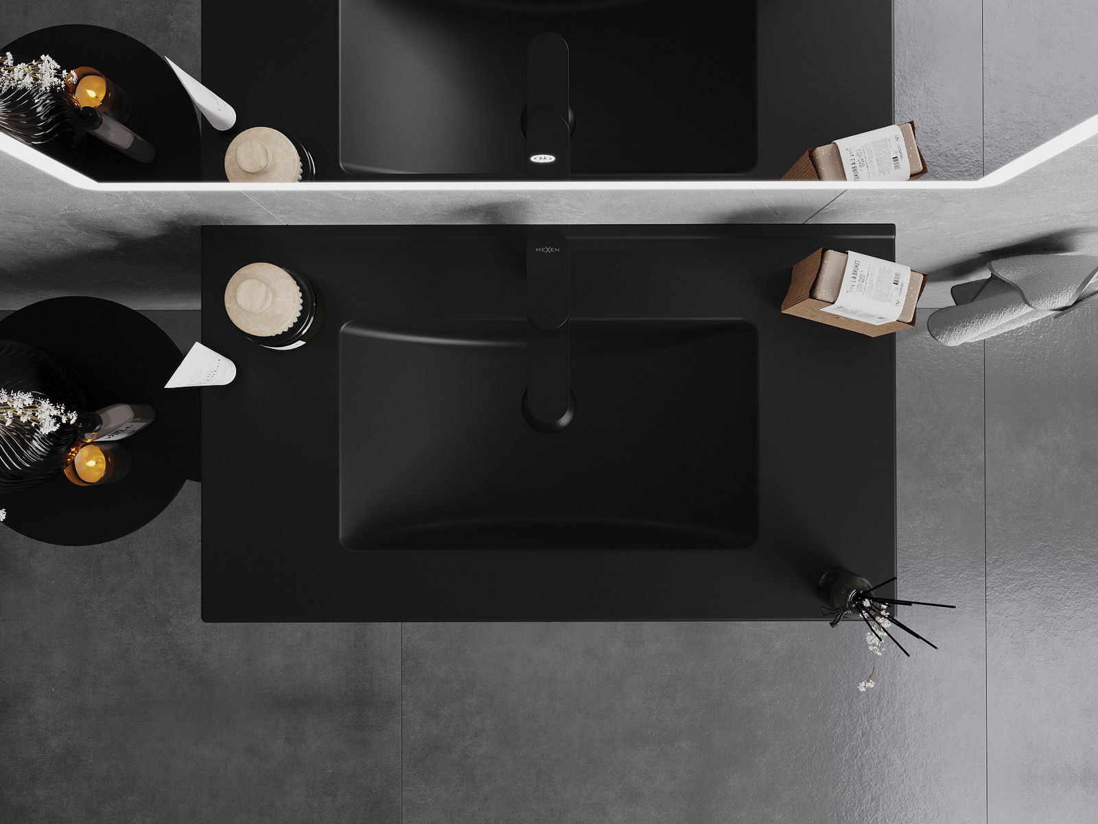 Die Spüle hat ein Loch, in dem wir die Batterie montieren können. Dies spart einen wertvollen Raum im Badezimmer und betont seine Ästhetik. Mit dieser Lösung können Sie auch einfach um die Spüle sauber bleiben.