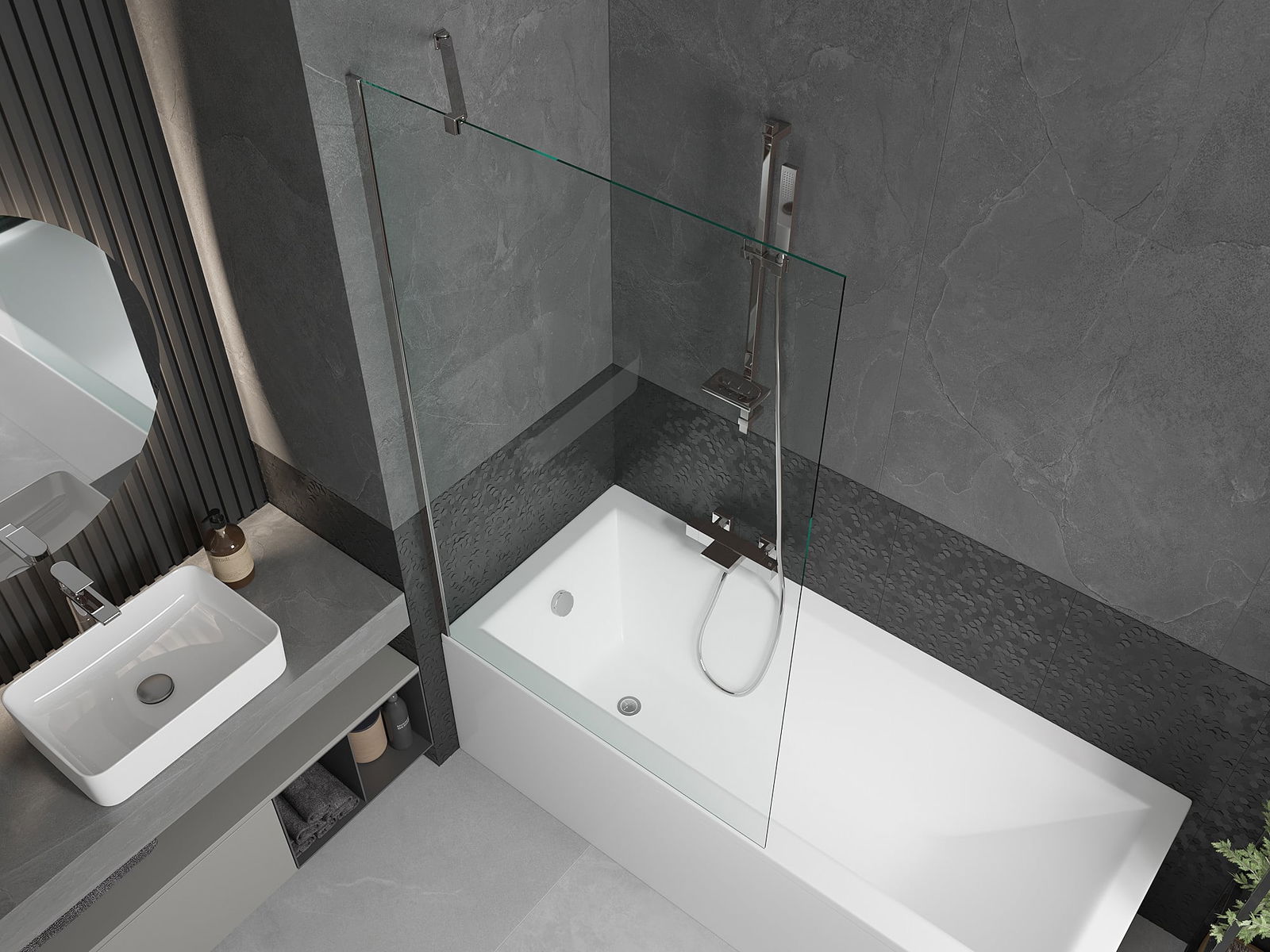 Effektiver Schutz vor dem Überlaufen von Wasser während des Badens. Die Duschwand verfügt über Dichtungen, die sich perfekt an die Glasscheibe und den Rand der Badewanne anpassen. Eine funktionale Lösung, die Sicherheit und einfache Reinigung gewährleistet.