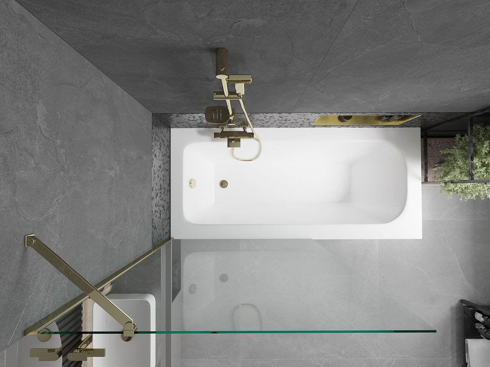 Mexen Vega Rechteckige Badewanne 160 x 70 cm mit Verkleidung und 1-flügeliger Trennwand 100 cm, transparent, gold