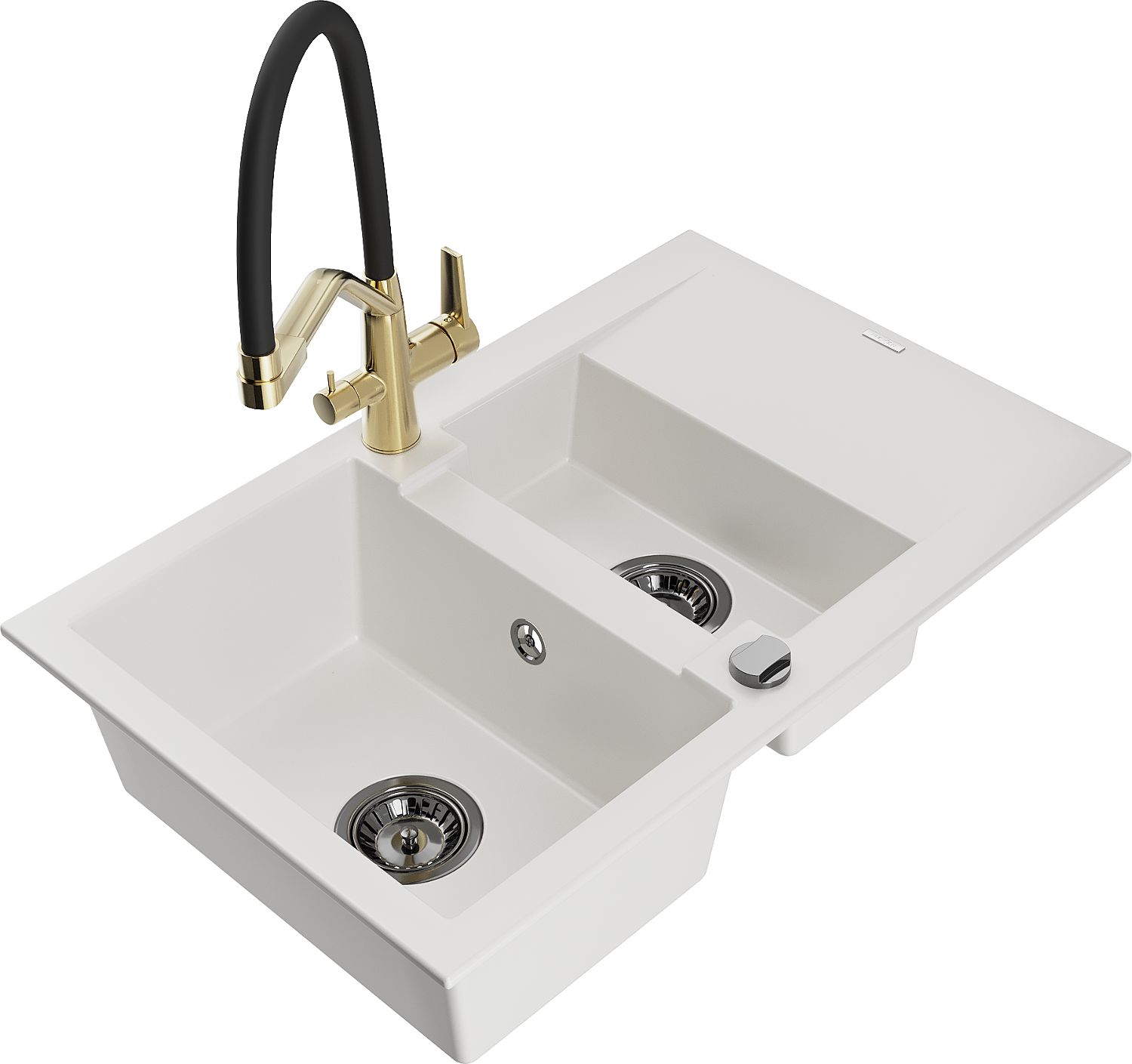 Mexen Gaspar Granitspüle 1,5-Becken mit Abtropffläche und Küchenarmatur Duo, Weiß - 6507-20-671701-57-B