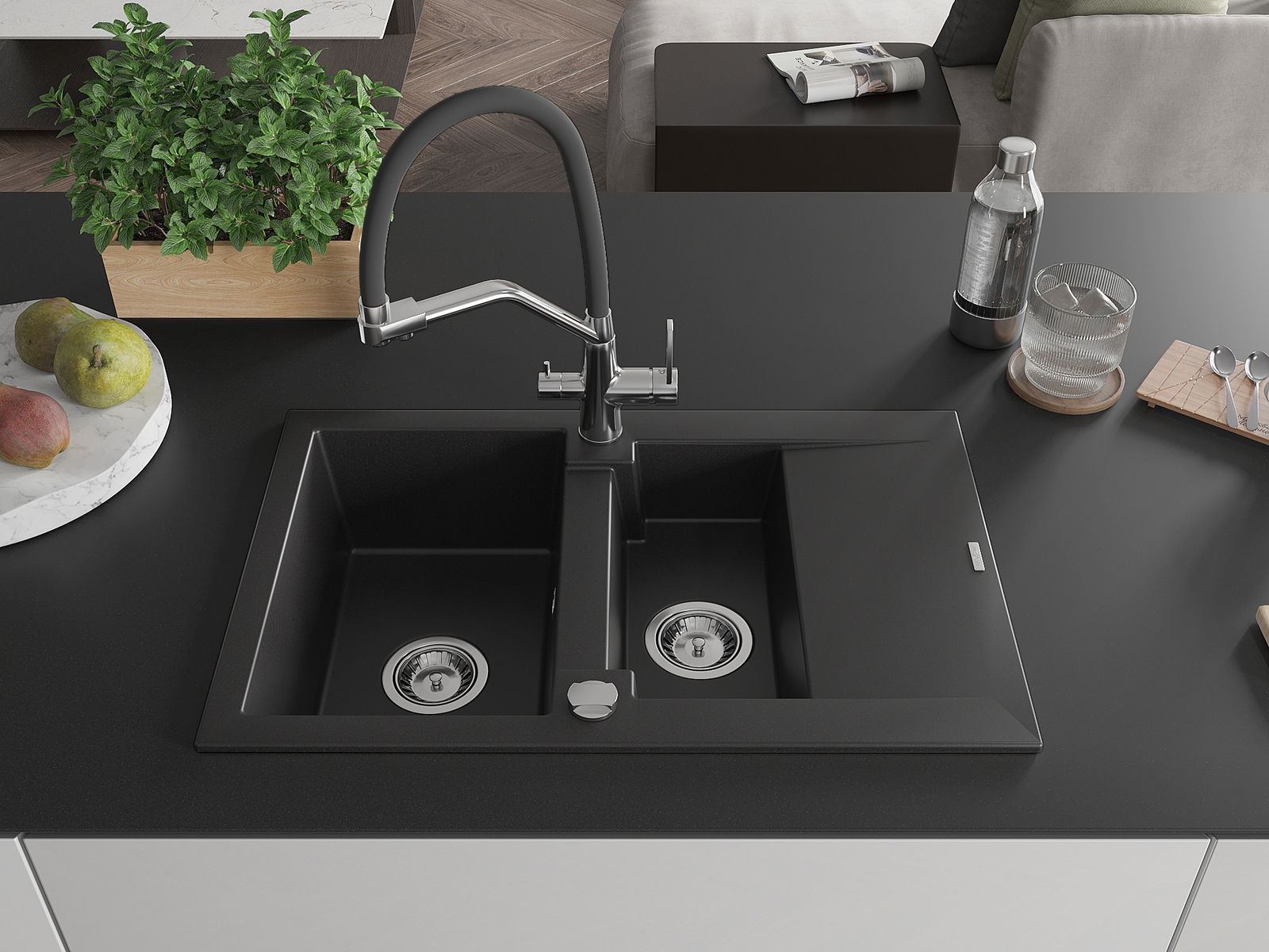 Mexen Gaspar Granitspüle 1,5-fach mit Abtropffläche und Küchenarmatur Duo, schwarz - 6507-77-671701-07