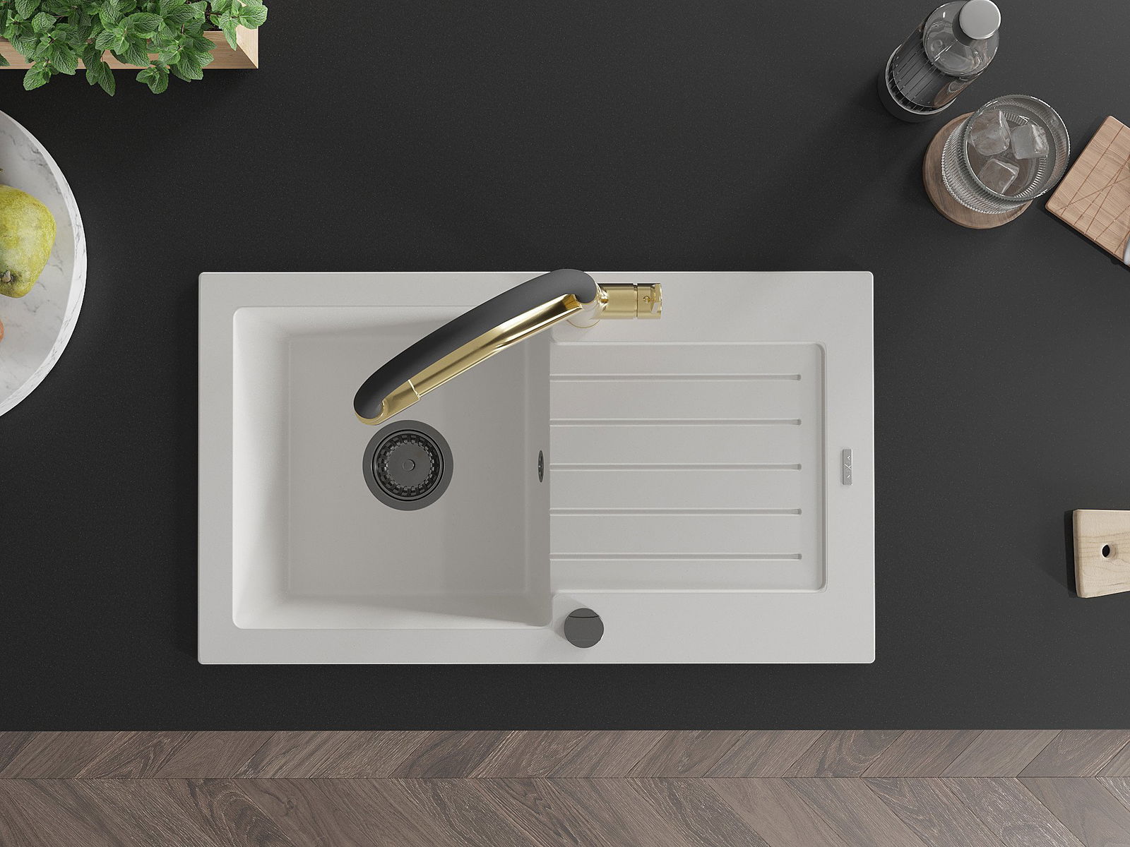 Mexen Pablo Granitspüle 1-beckig mit Abtropffläche und Küchenarmatur Duo, weiß - 6510-20-671701-57-B