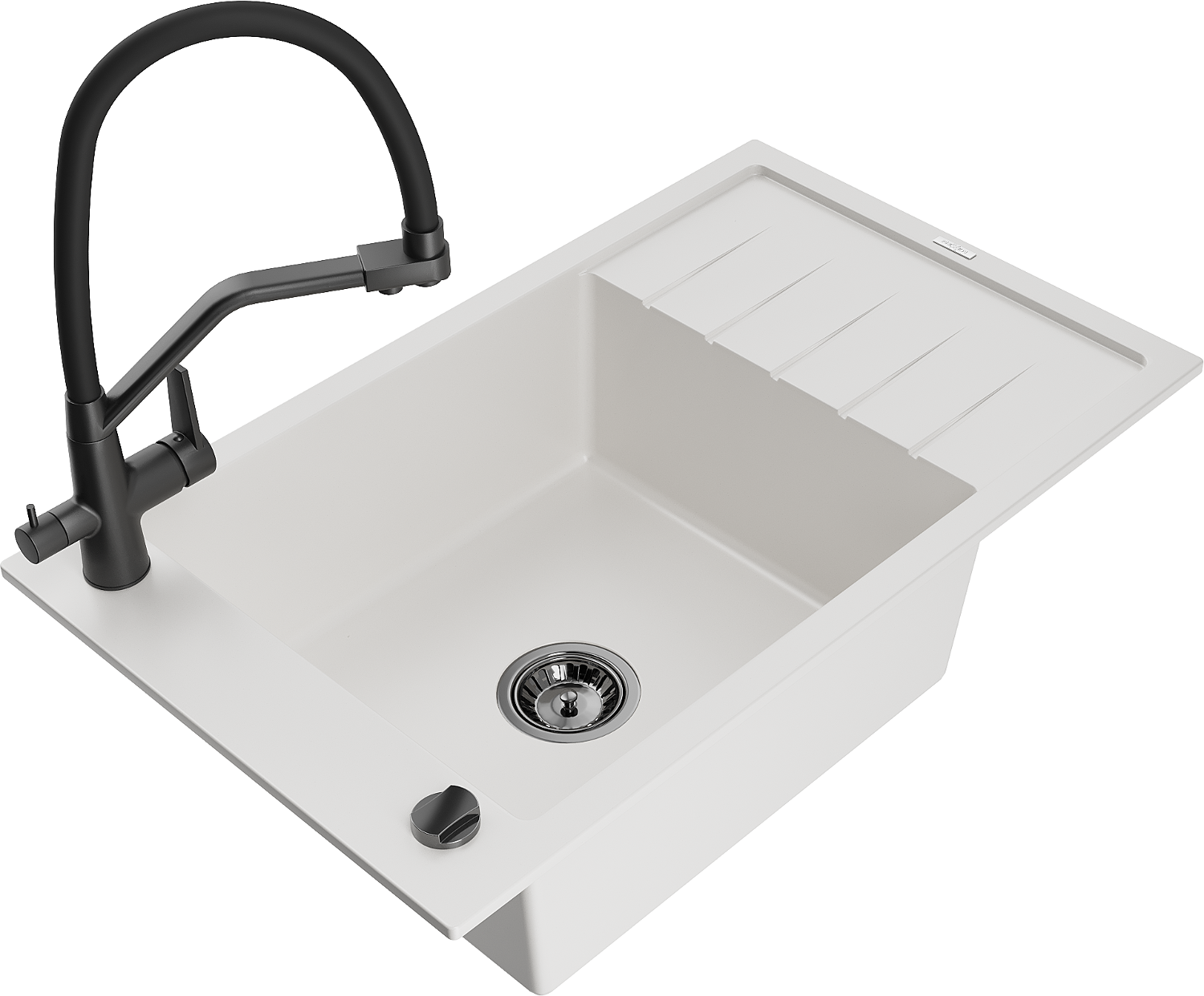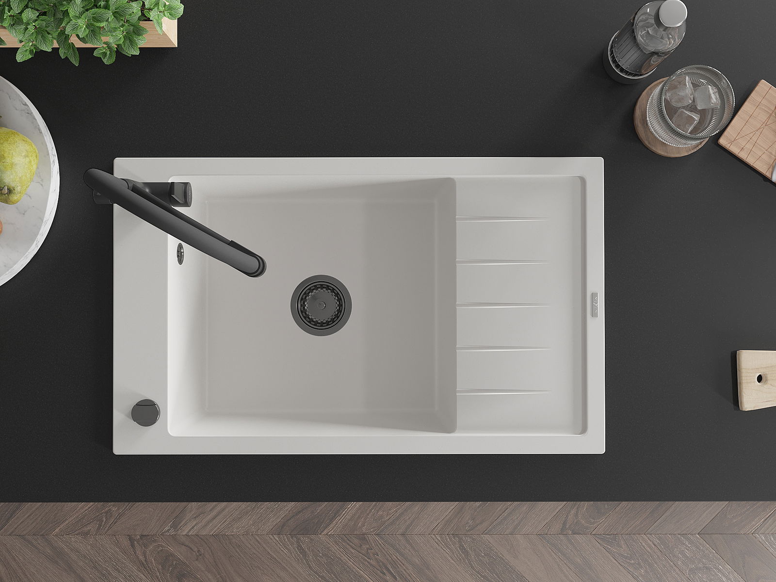 Mexen Elias Granitspüle 1-beckig mit Abtropffläche und Küchenarmatur Duo, weiß - 6511-20-671701-70-B