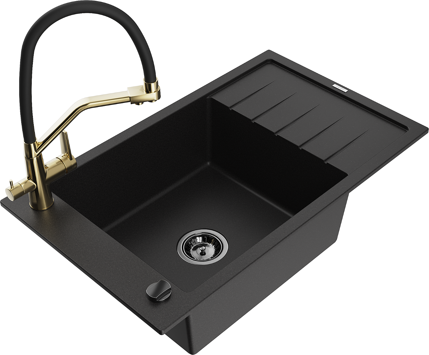 Mexen Elias Granitspüle 1-beckig mit Abtropffläche und Küchenarmatur Duo, schwarz - 6511-77-671701-57-B