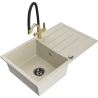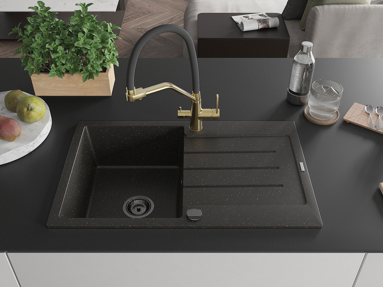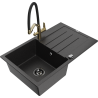 Mexen Bruno Granitspüle 1-Becken mit Abtropffläche und Küchenarmatur Duo, schwarz/goldener Metallic - 6513-75-671701-57-B