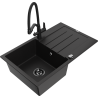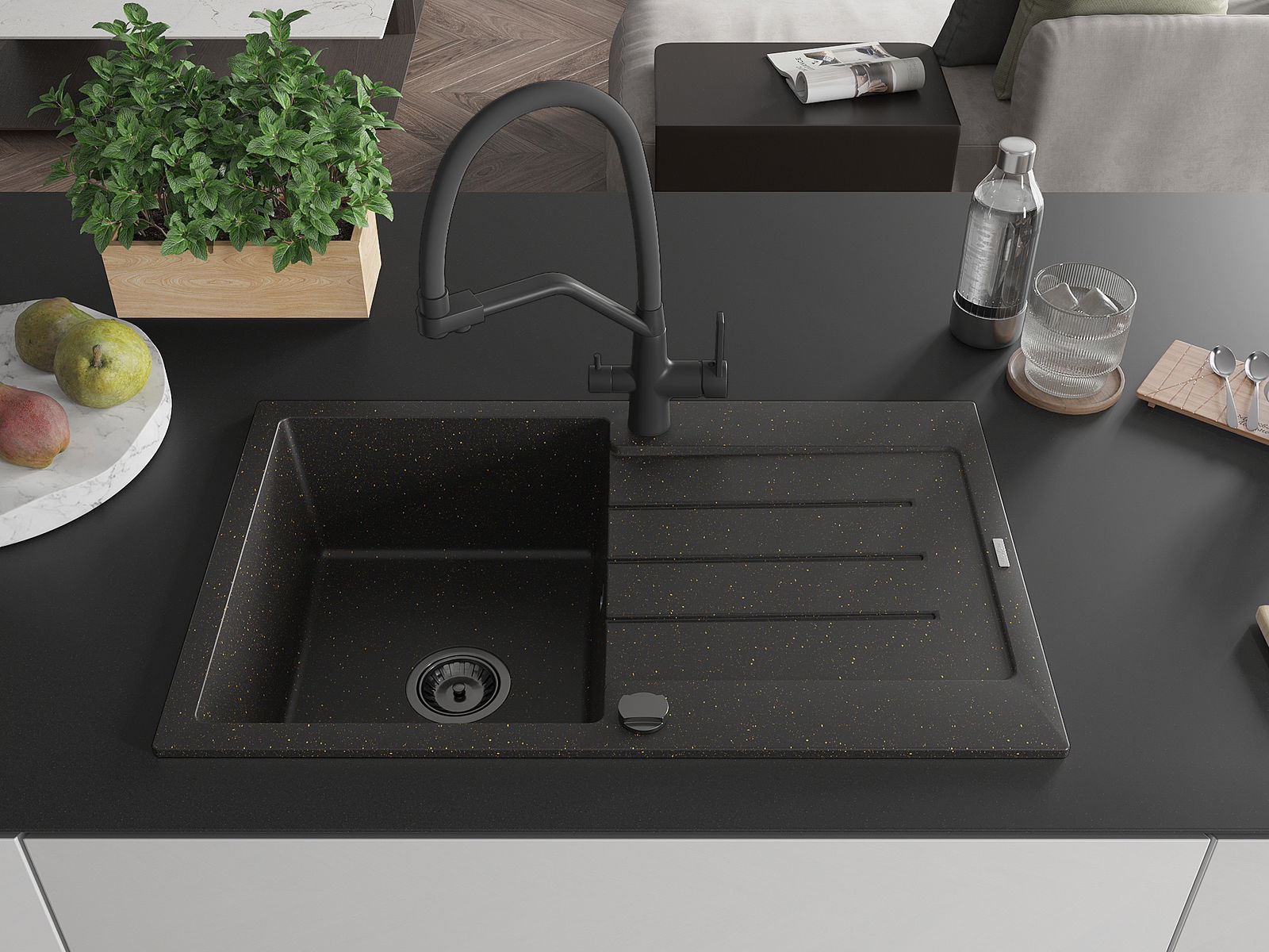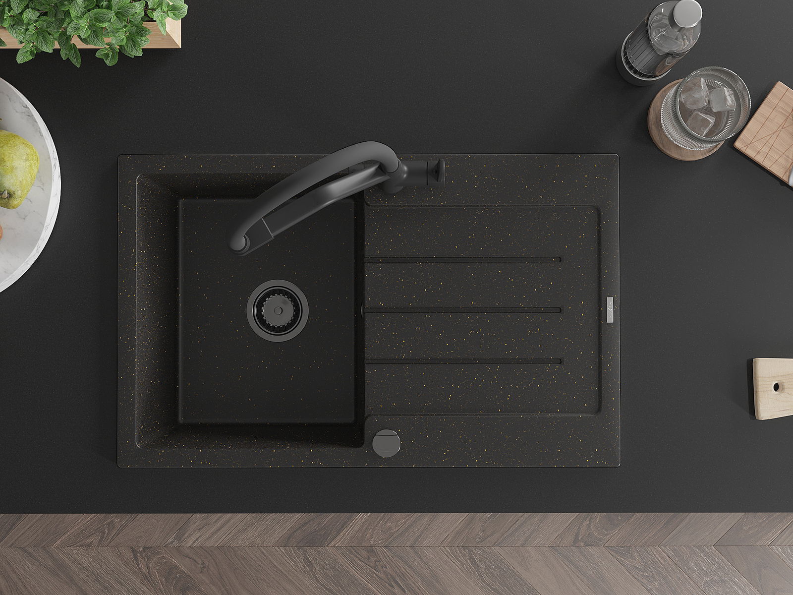 Mexen Bruno Granitspüle 1-Becken mit Abtropffläche und Küchenarmatur Duo, schwarz/gold metallic - 6513-75-671701-70-B