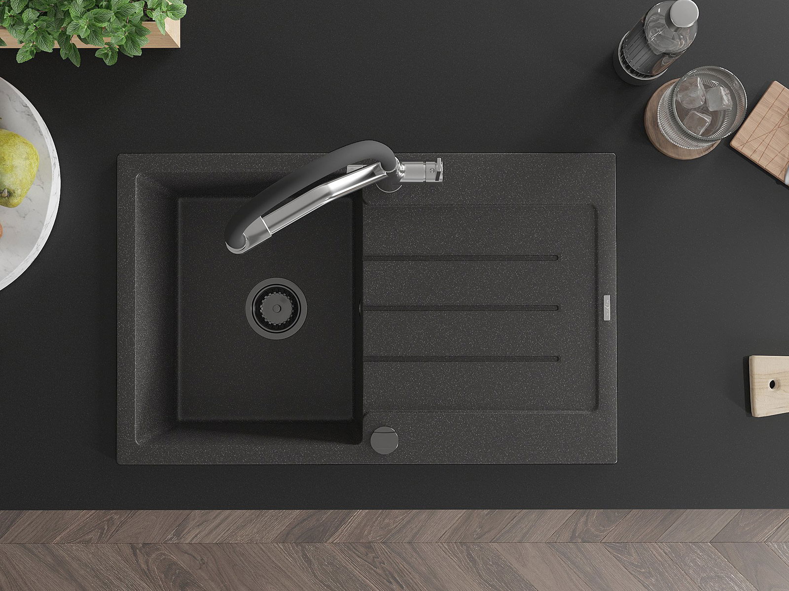 Mexen Bruno Granitspüle 1-Kammer mit Abtropfbereich und Küchenarmatur Duo, schwarz gesprenkelt - 6513-76-671701-07-B