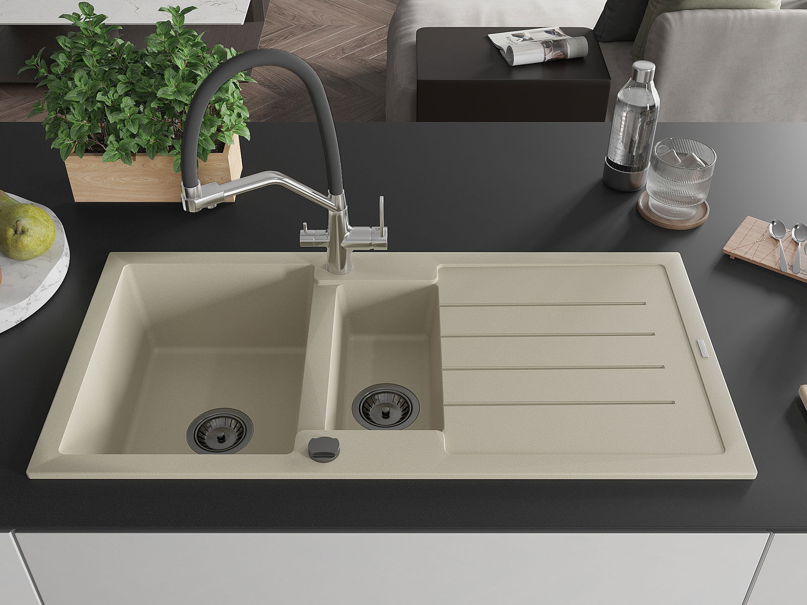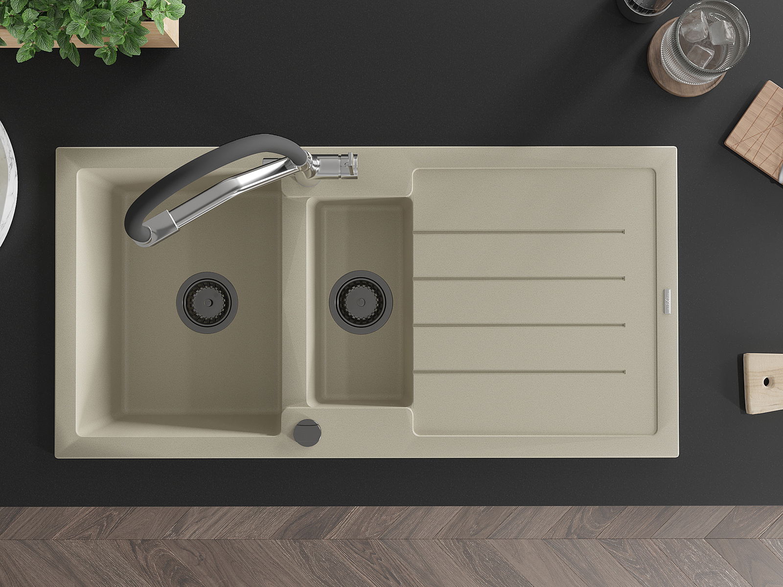 Die Spüle besteht aus hochwertigem Granit. Es ist eine elegante und vor allem praktische Ergänzung zu jeder Küche, unabhängig von ihrem Stil. Hohe Qualität und Granitdauer sorgen für eine langjährige Nutzung.