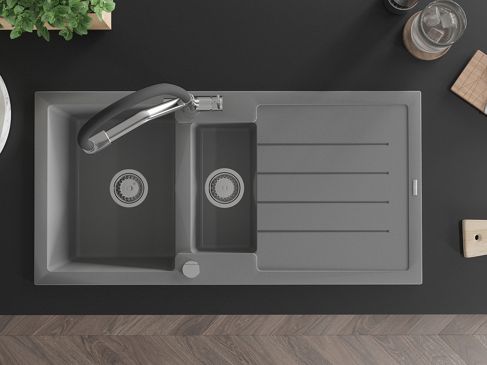 Die Spüle besteht aus hochwertigem Granit. Es ist eine elegante und vor allem praktische Ergänzung zu jeder Küche, unabhängig von ihrem Stil. Hohe Qualität und Granitdauer sorgen für eine langjährige Nutzung.