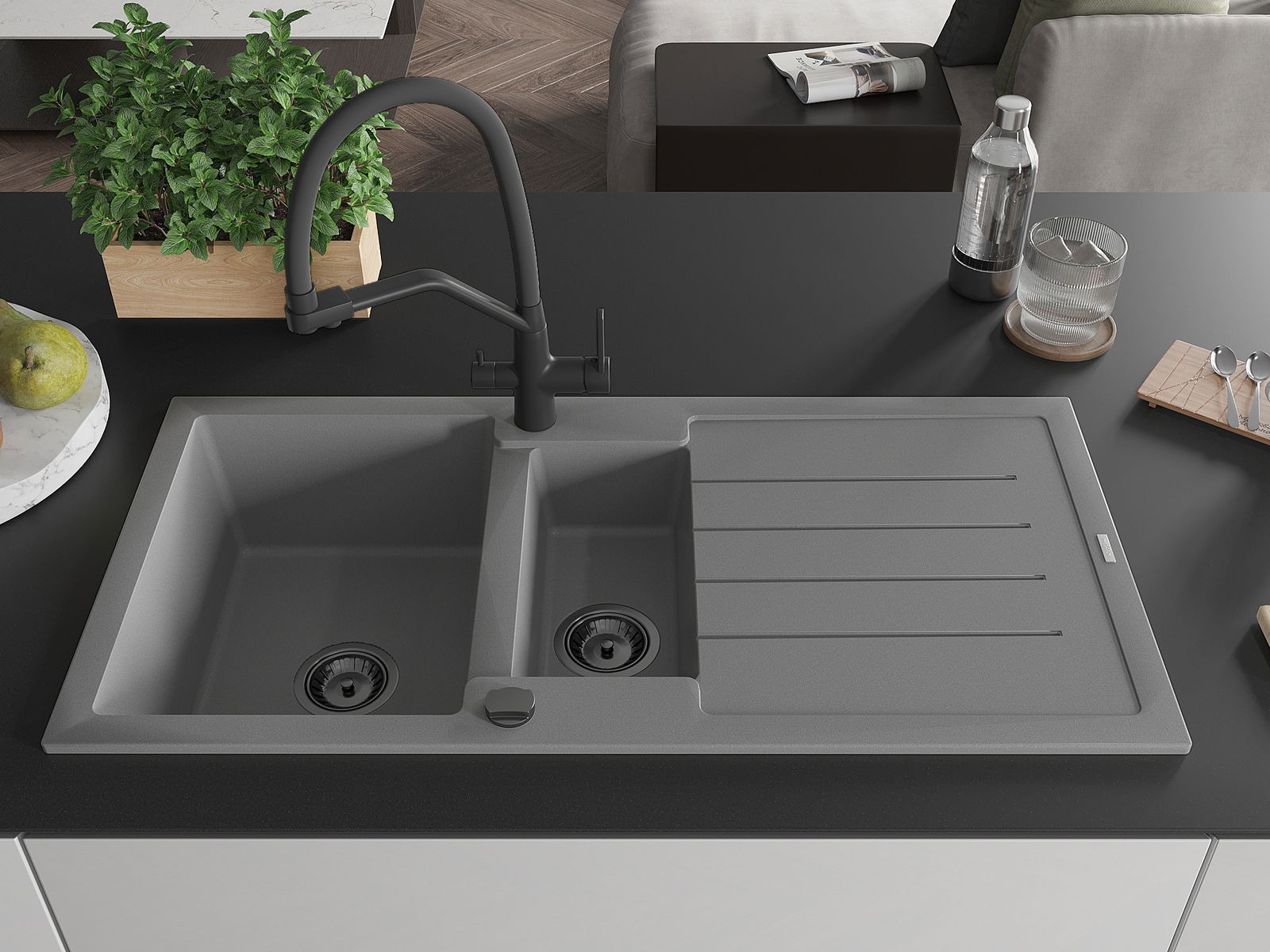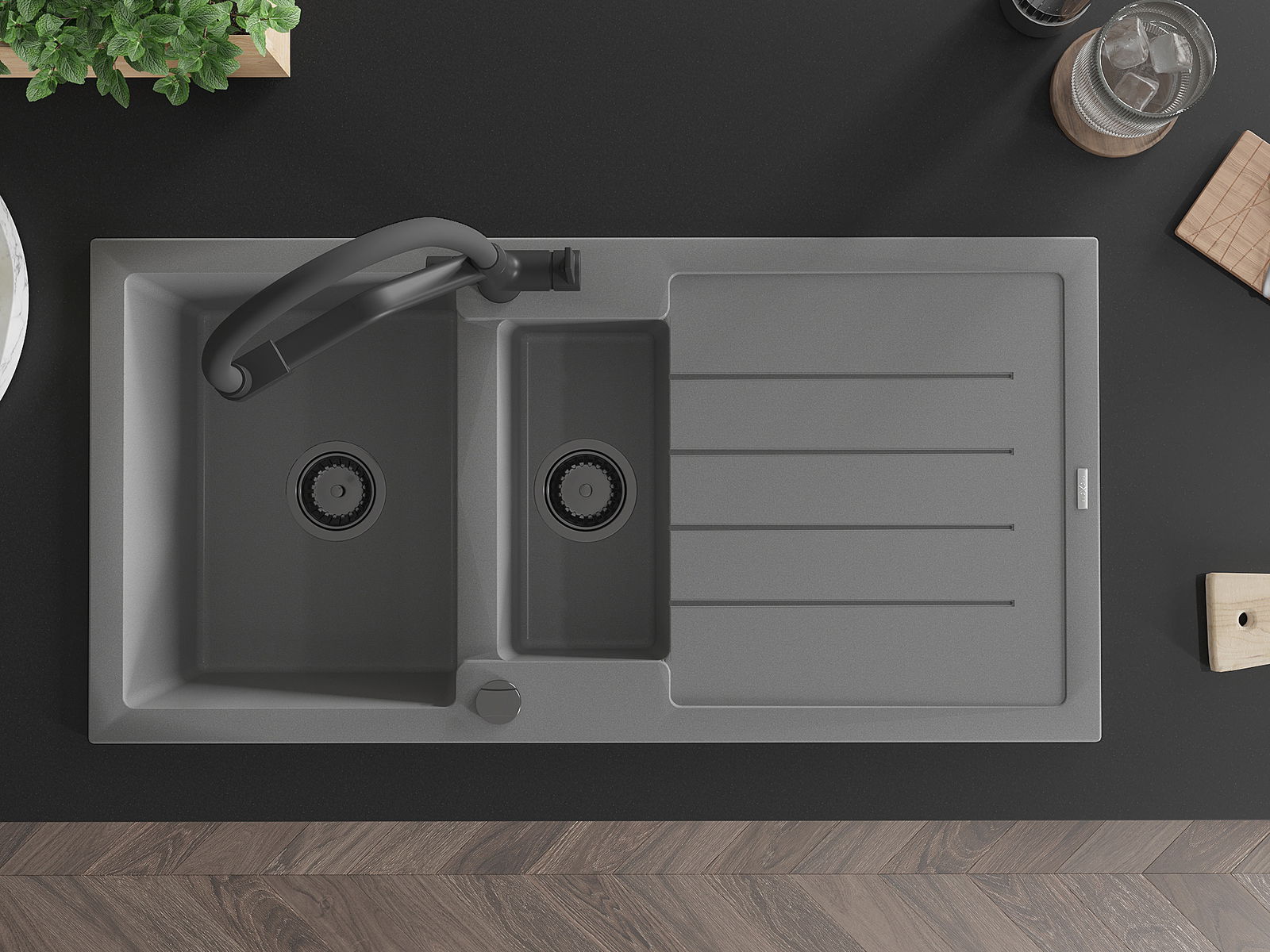 Die Spüle besteht aus hochwertigem Granit. Es ist eine elegante und vor allem praktische Ergänzung zu jeder Küche, unabhängig von ihrem Stil. Hohe Qualität und Granitdauer sorgen für eine langjährige Nutzung.